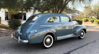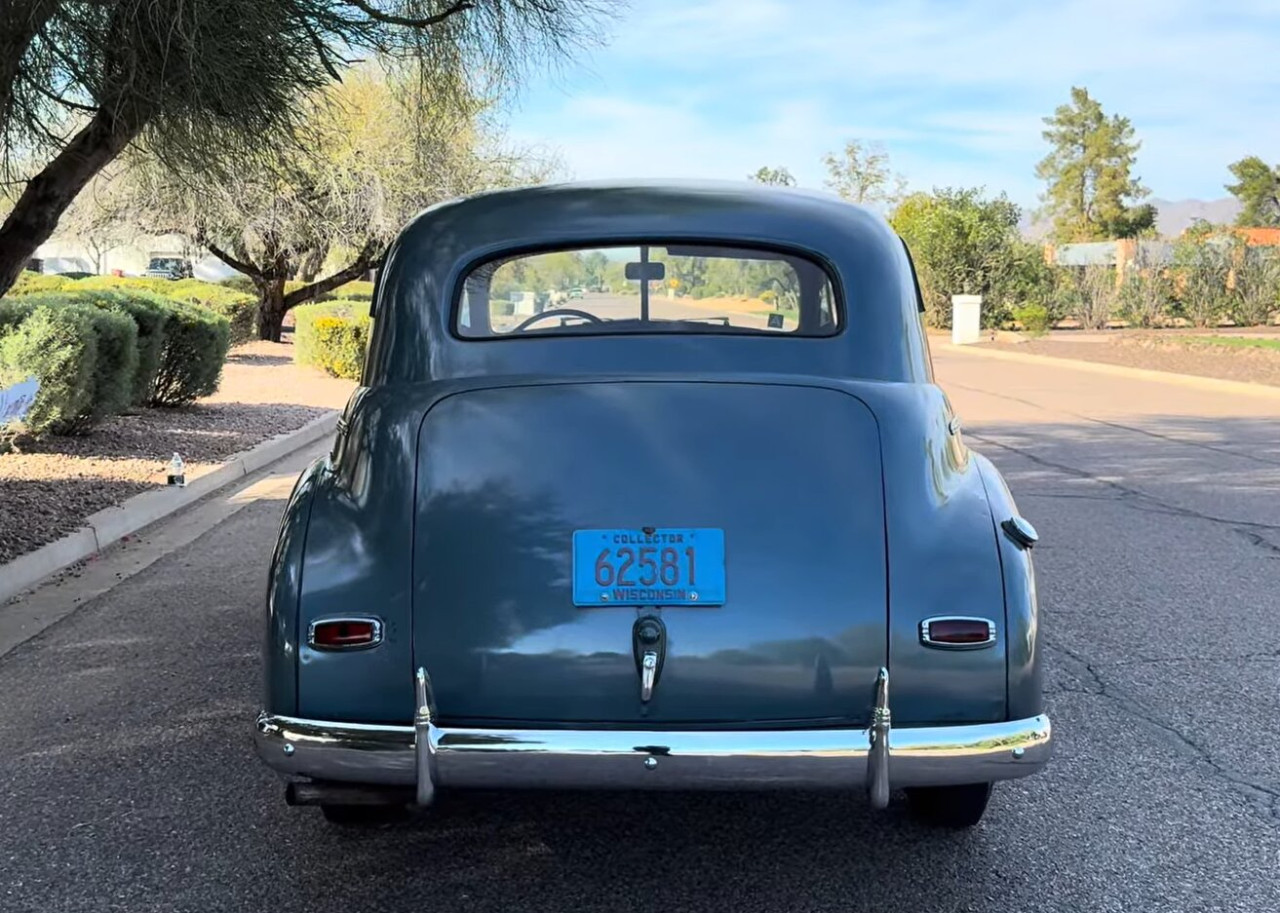 Двувратен седан от 1941 г. Оригинален редови шестцилиндров Stovebolt двигател Пребоядисан в оригинален Squadron Gray Metallic Запазен фабричен интериор с бежов плат Исторически стикер за гориво от Втората световна война