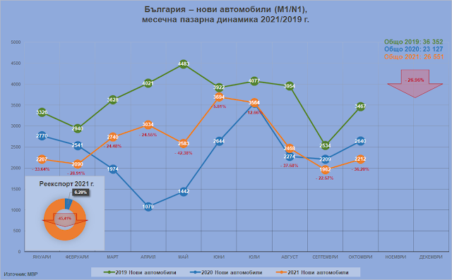 За десет месеца разликата между 2021 и 2019 брои цели 10 000 автомобила – величина, която сигурно не подлежи на компенсиране през 2022-а; дори да стане немислимото и следващото редовно правителство незабавно да се захване с отдавна гниещата проблематика на българската моторизация.