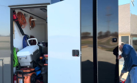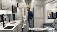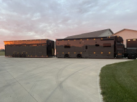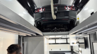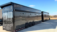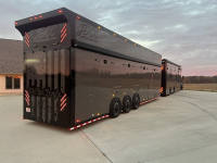 Ремаркето е не по-малко впечатляващо. Вътре има място за три автомобила – един на долното ниво и два отгоре, като долният етаж може да побере и голф колички. Предната част предлага проходим отсек за мотори, а специалните стелажи за гуми са достъпни през т.нар. „fat man door“. Захранването се поема от дизелов генератор Onan, който осигурява пълна независимост.