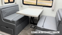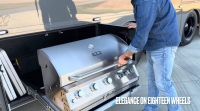 Кухнята е на ниво, което рядко се вижда дори в луксозни кемпери. Мраморните плотове крият индукционен котлон InvisaCook, а големият хладилник с отделно чекмедже и шкафовете от ръчно обработен хикори допълват усещането за истински дом. Навън пък ви очаква втора, външна кухня с шесткотлоново барбекю, изтеглящ се хладилник и 65-инчов смарт телевизор, всичко това защитено от електрически сенник с дължина над 9 метра.