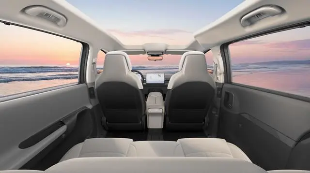 Интериорът разчита на праволинейна централна конзола и „плаващ“ централен екран. Цветовата схема е основно бяла с черни акценти, със седалки с ромбовидни шевове и панорамен покрив. Посочено е и наличие на плъзгащи се врати.