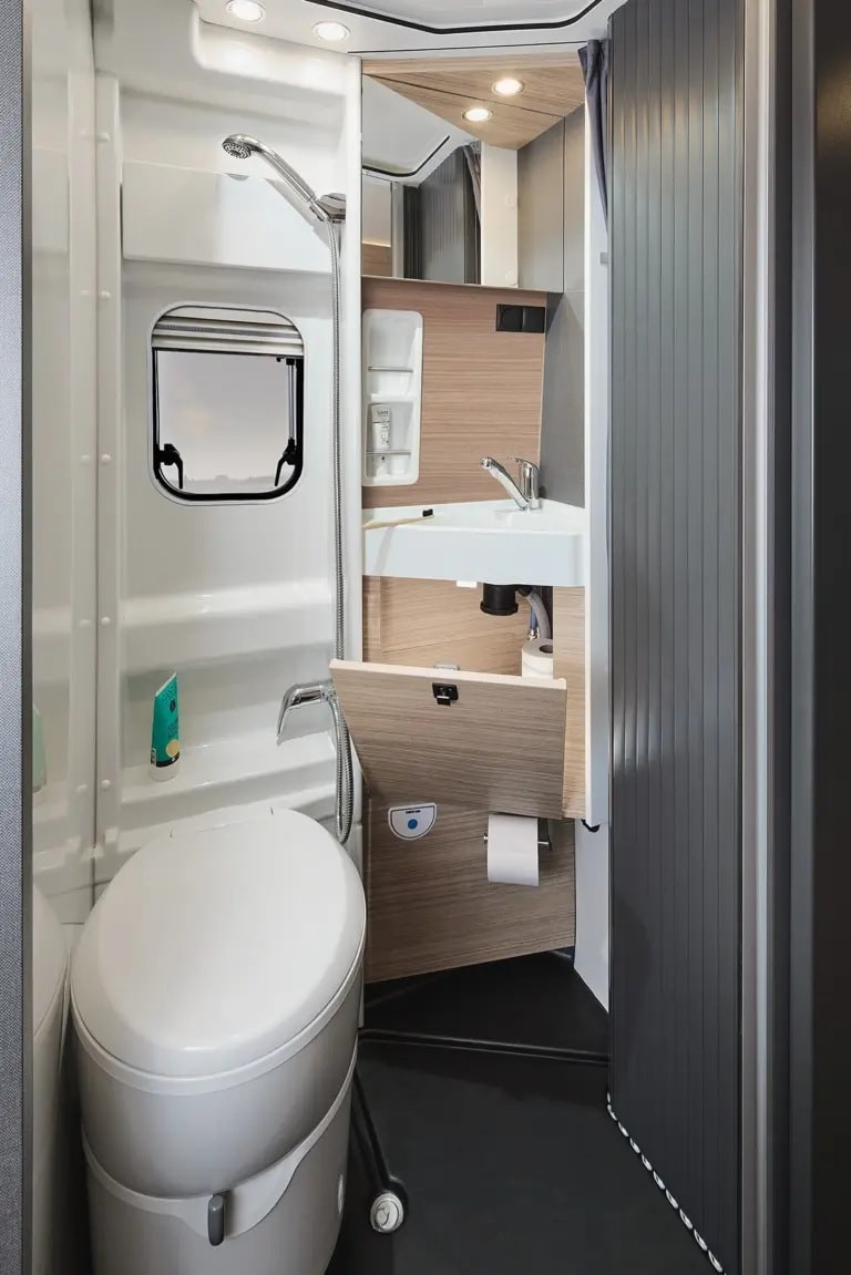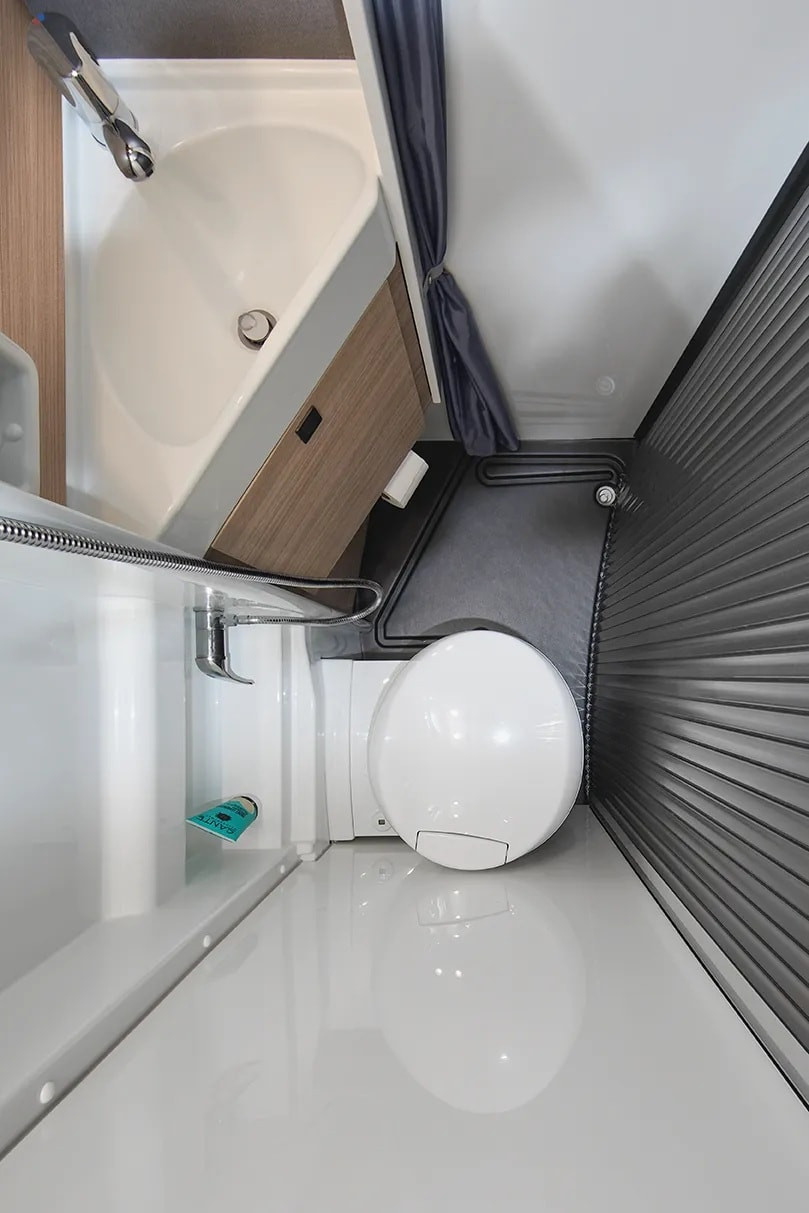 Секторният параван освобождава място за душ, тоалетна, малка мивка и практични отделения за съхранение.