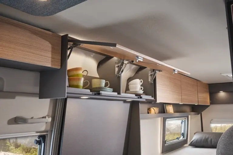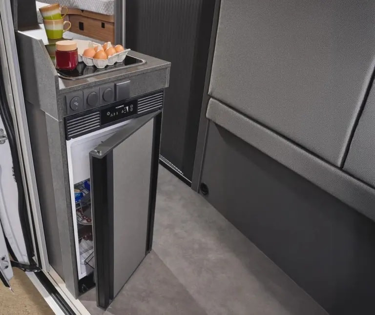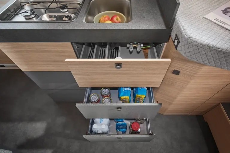 Кухнята разполага с 69-литров компресорен хладилник с двустранно отваряне, двукинов газов котлон с електрическо запалване, вградена мивка и три чекмеджета със soft-close механизъм.