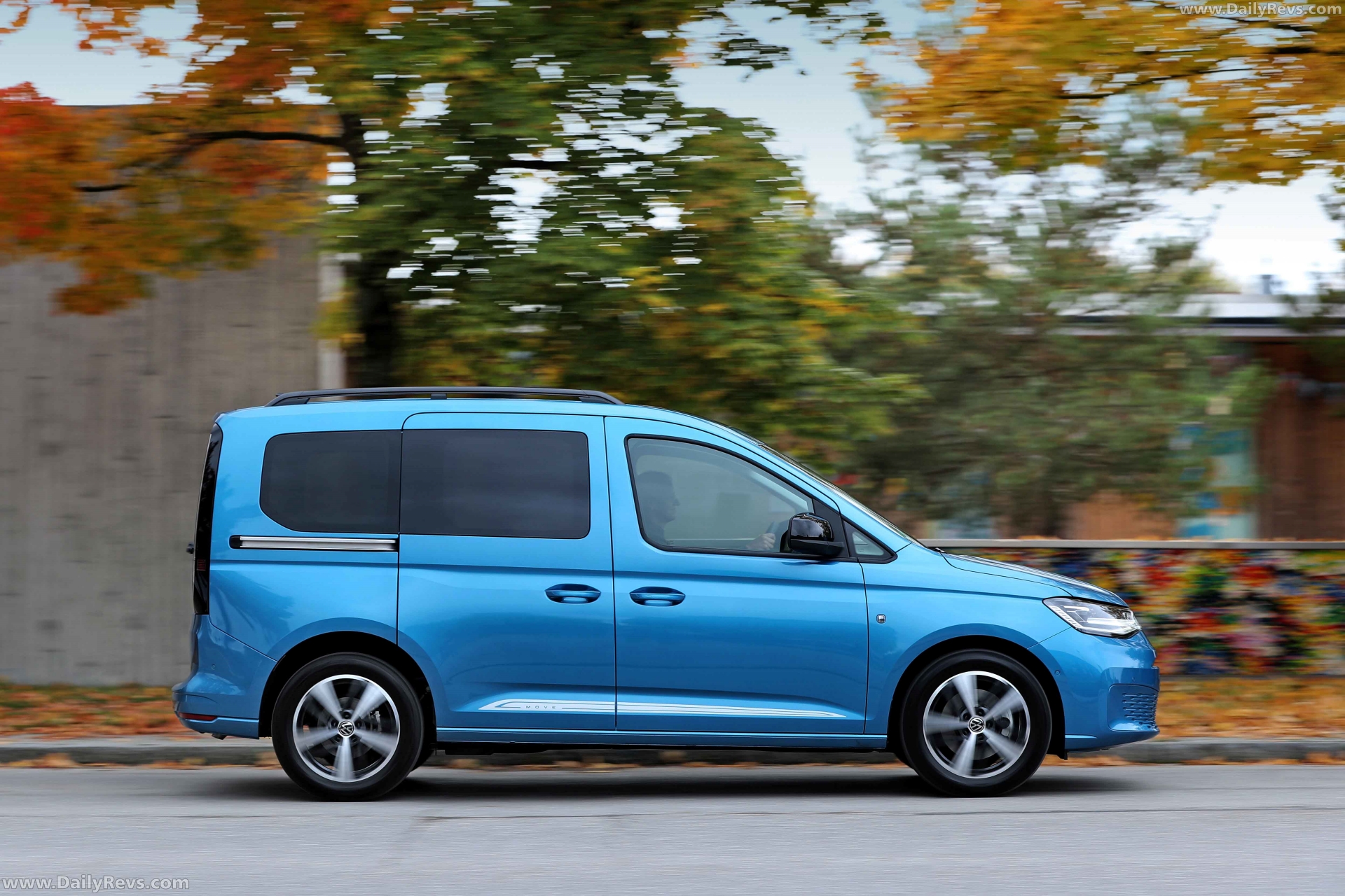 Външността на късата (4,50/1,86/1,83 м), пътническа версия на модела с най-високото ниво на оборудване Style съхранява типичния ванообразен, без малко еднообемен профил, максимизиращ вътрешното му пространство. Строгата геометрична външност на предшественика обаче е подложена на флуидно омекотяване (на което се дължи намаленото до 0,30 въздушно съпротивление), добавена й е обемна пластичност и е облагородена с естетични акценти, улесняваши плъзгането на погледа по високия му силует. Минималистичният преден дизайн със стеснени диодни светлини и предна решетка в духа на пчелната пита се допълва хармонично от видимите усилия за подобряване на аеродинамичната ефективност отзад с добре изглеждащи вертикални диоди и характерния вдлъбнат релеф на голямата електрически подпомагана (опция) единична задна врата. След провала на Mercedes-Benz с недостатъчно индивидуализирания и трудно защитаващ ценовата си премия Citan, VW Caddy зае самотно ролята на премиум продукт в компактния товаропътнически сегмент, а с външността си петото му издание обитава това пространство с още по-голяма убедителност.