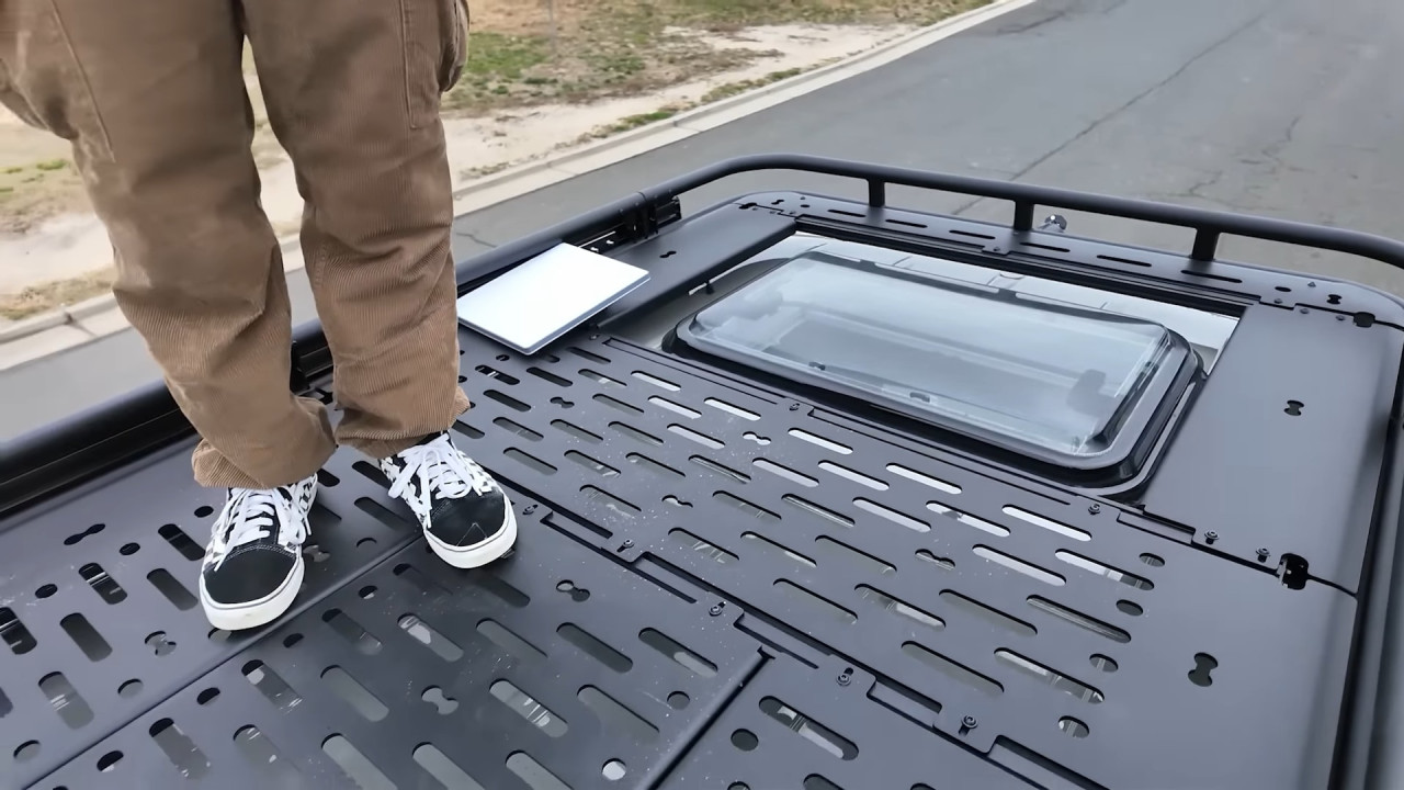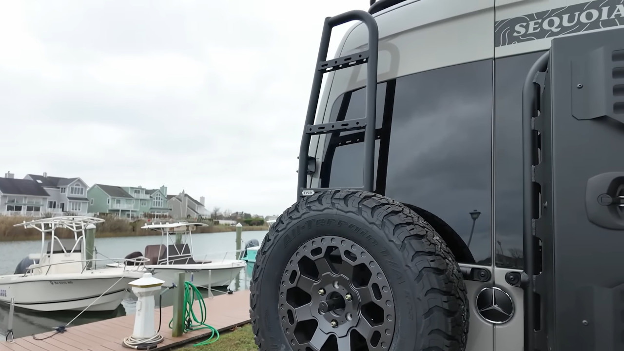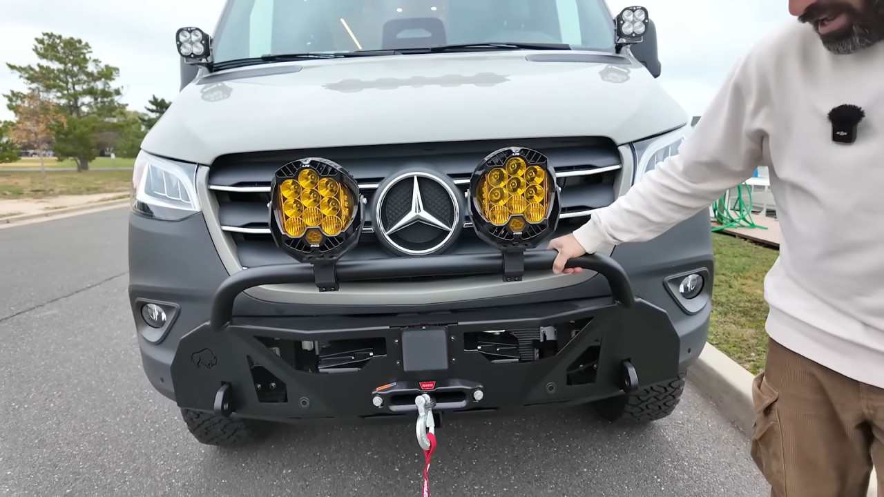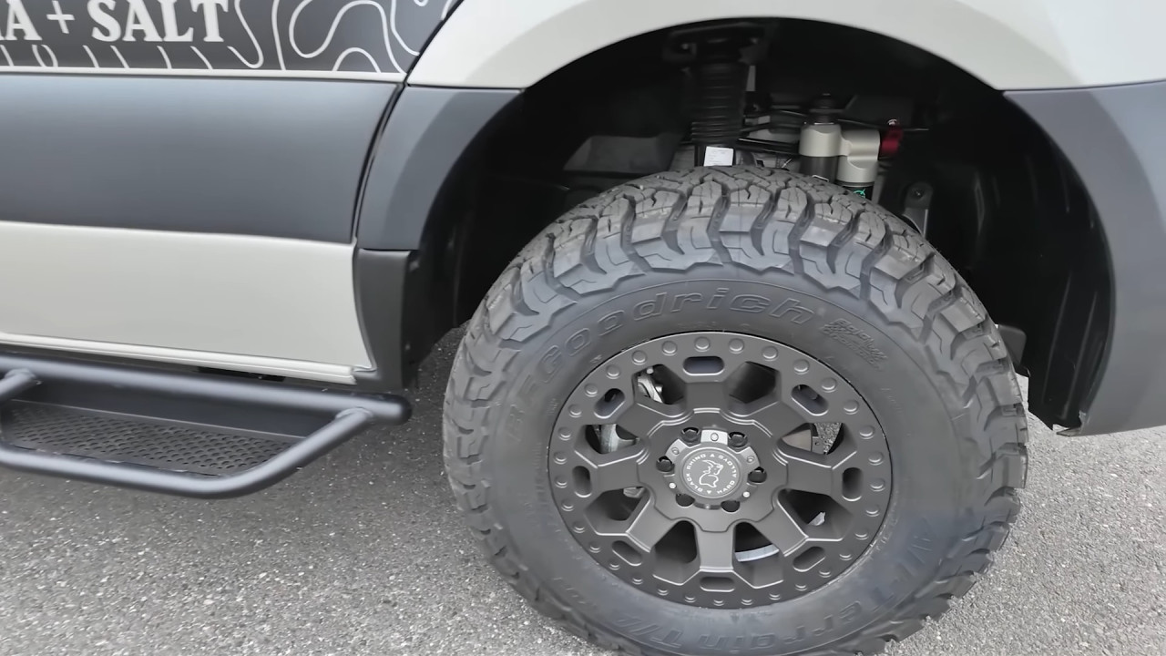 Външният вид веднага подсказва офроуд потенциала: 17-инчови джанти Black Rhino с гуми BFGoodrich KO3, регулируемо Van Compass Stage 4.3 окачване, броня Roambuilt отпред с лебедка Warn 12 000 lb, допълнителни светлини Baja Designs LP6 и LP9, както и багажник Safari FVC с 400 W соларни панели, антена StarLink Mini и тента Fiamma F45S. Задната част предлага носачи за резервна гума, товарна кутия и лесен достъп до покрива чрез стълба.