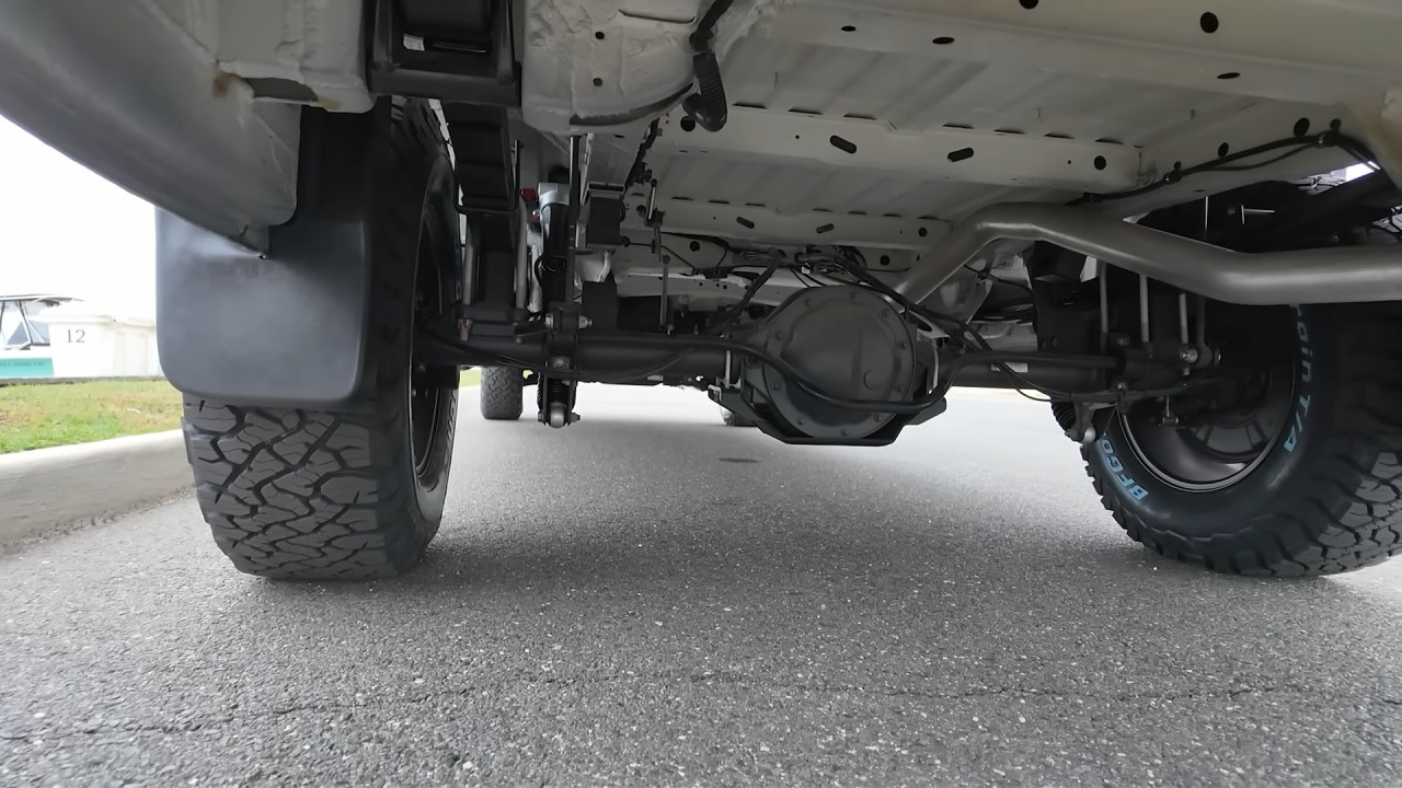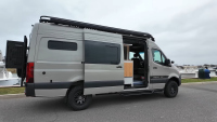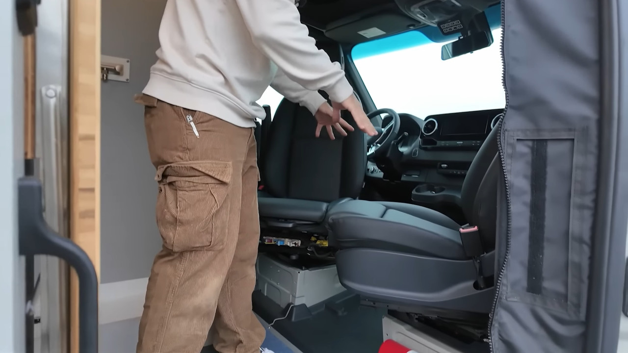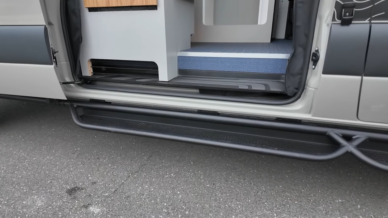 Външният вид веднага подсказва офроуд потенциала: 17-инчови джанти Black Rhino с гуми BFGoodrich KO3, регулируемо Van Compass Stage 4.3 окачване, броня Roambuilt отпред с лебедка Warn 12 000 lb, допълнителни светлини Baja Designs LP6 и LP9, както и багажник Safari FVC с 400 W соларни панели, антена StarLink Mini и тента Fiamma F45S. Задната част предлага носачи за резервна гума, товарна кутия и лесен достъп до покрива чрез стълба.
