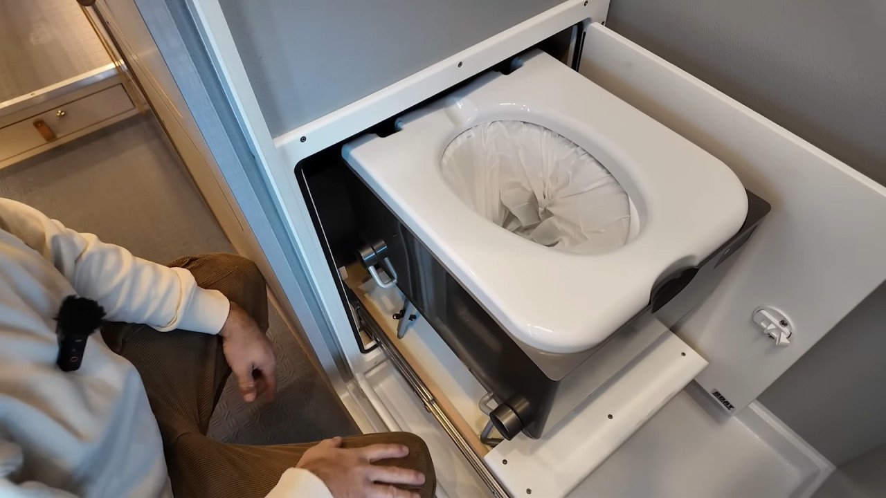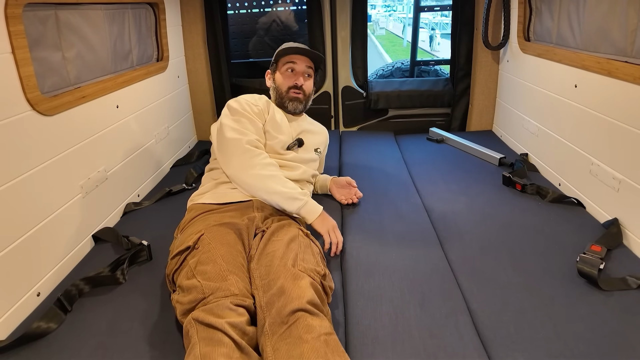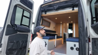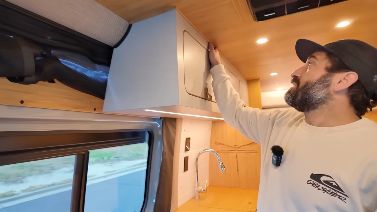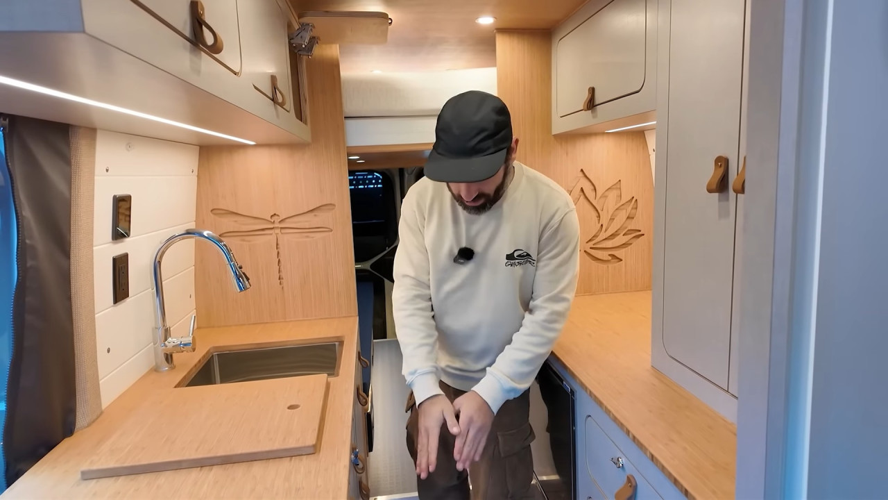 Комфортът е ключов: баня с душ и dry-flush тоалетна, кухня с голяма мивка, хладилник/фризер и едноконфорков индукционен котлон. Трапезарията се трансформира в легло, а основното спане е чрез елеваторно легло, което се спуска и вдига с бутон. За почистване има вградена прахосмукачка RoadVac.