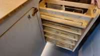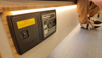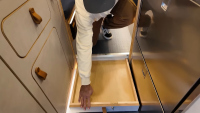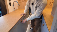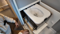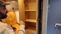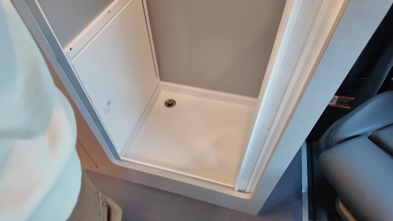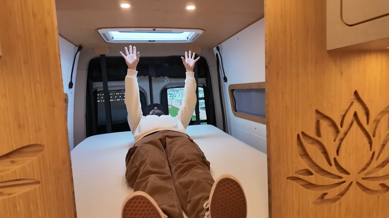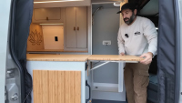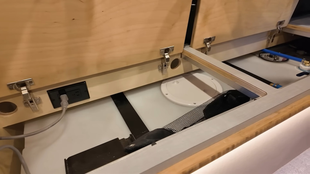 Комфортът е ключов: баня с душ и dry-flush тоалетна, кухня с голяма мивка, хладилник/фризер и едноконфорков индукционен котлон. Трапезарията се трансформира в легло, а основното спане е чрез елеваторно легло, което се спуска и вдига с бутон. За почистване има вградена прахосмукачка RoadVac.