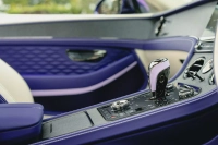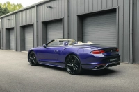 Този Bentley Continental GTC Speed не желае да се слива с тълпата. Купувачът е избрал ексклузивния оттенък Violette, смесващ пурпур и синьо. Контрастът се подсилва от черни емблеми, черни джанти и черна радиаторна решетка. Платненият покрив е тъмносив, допълвайки драматичния силует.