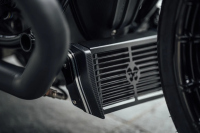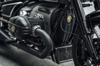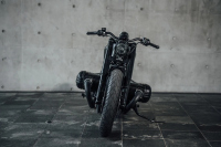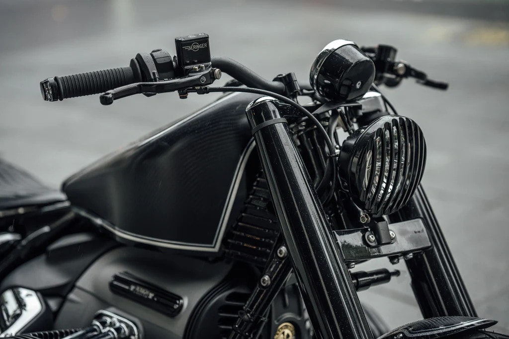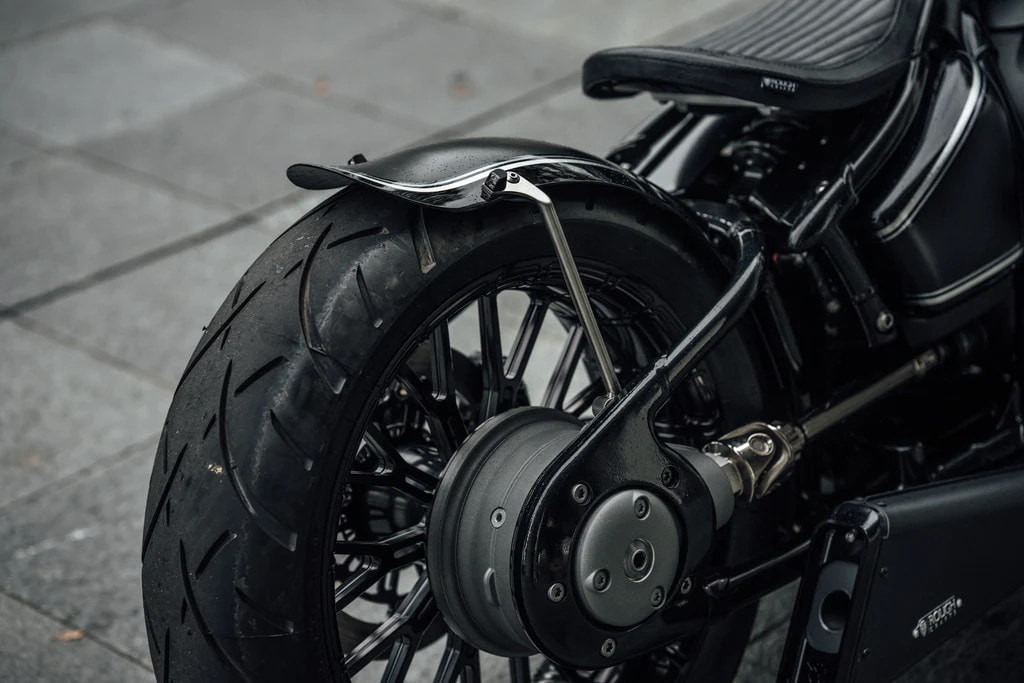За по-низка стойка се монтира нов заден амортисьор, по-къс с 40 mm от заводския. Отпред има снишени вилки с прогресивни пружини. Сетът се допълва от ковани алуминиеви джанти Arlen Ness – 21 " отпред и 18 " отзад, обути с Metzeler ME 888 Marathon. Спирането е поверено на Beringer: шестбутални апарати и плаващи дискове отпред плюс четирибутален апарат отзад, управлявани от първокласни помпи на същата марка.