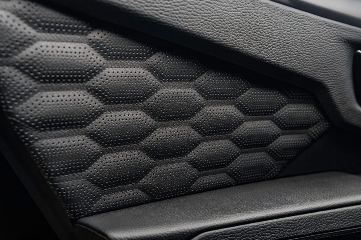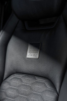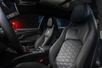 Интериорът е изпълнен в черна кожа и Alcantara, като карбоновата тема продължава и в кабината. Като контраст в тъмната среда са посочени алуминиевите педали и опора за крака, както и червеният капак на бутона за старт/стоп на централната конзола.