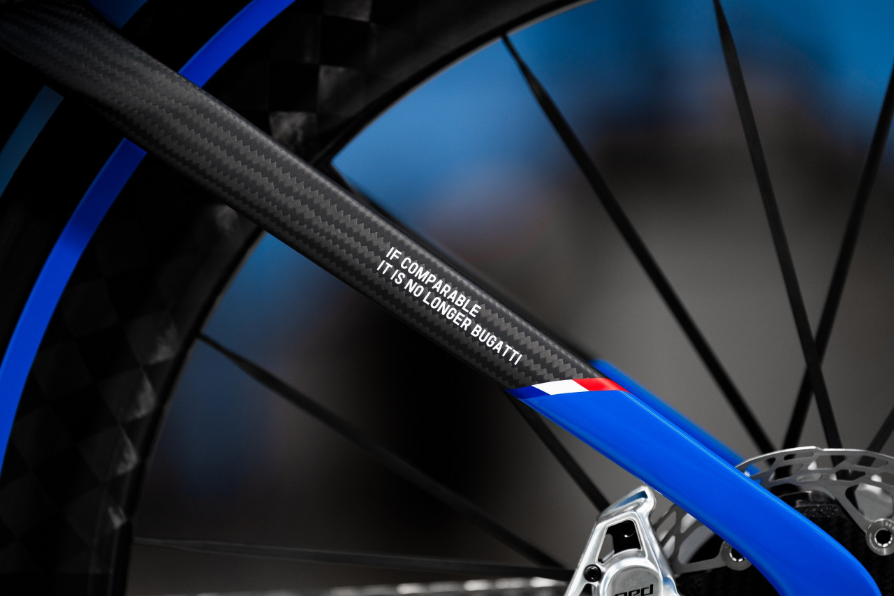 Дизайнът е в синя цветова схема с двуцветна графика, характерна за Bugatti, като името на марката е изписано с големи бели букви върху рамката. В предната част е поставен символът Dancing Elephant, който добавя характер и уникалност на колелото.