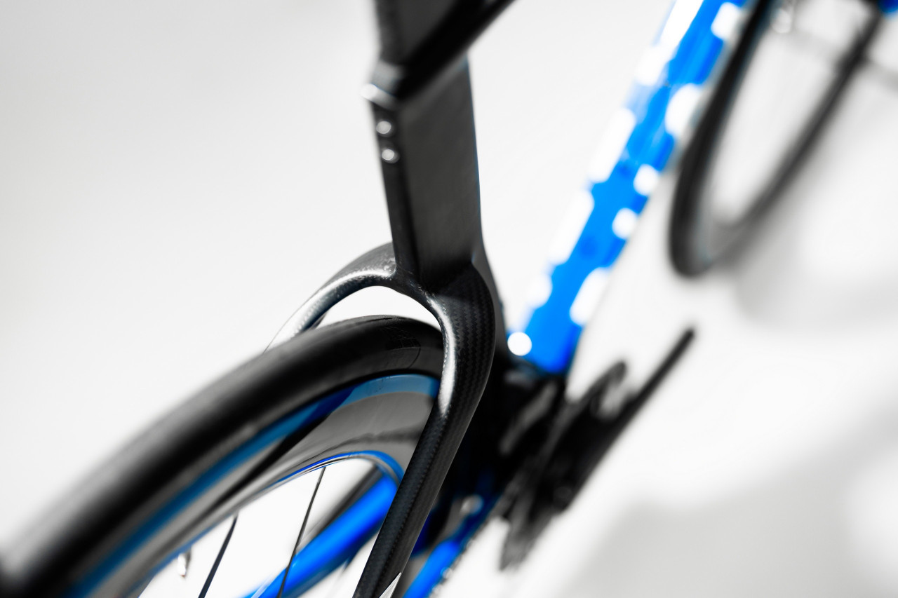 Проектиран с аеродинамика на преден план, рамката от въглеродни влакна е с по-широка стойка на вилката, което създава по-ниско въздушно съпротивление, макар и понякога да излиза извън строгите UCI правила. Вилката с ширина 147 мм превишава стандартните 115 мм, но целта е ясна: максимално представяне и скорост.