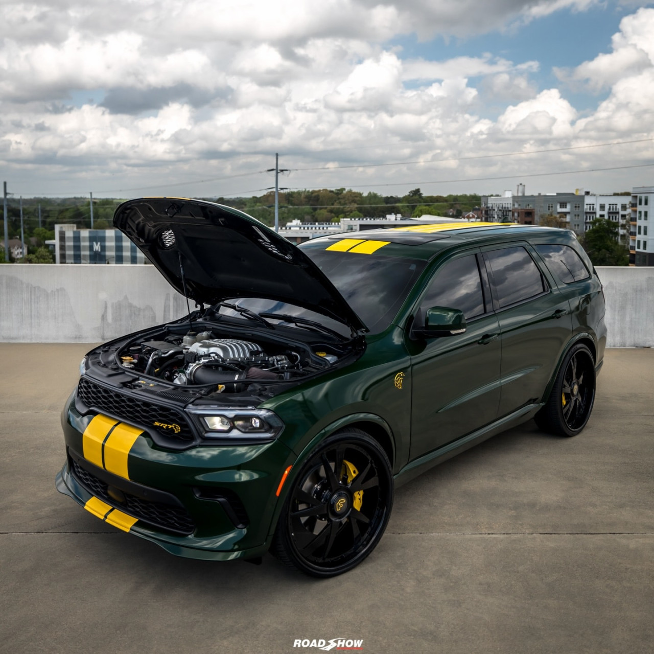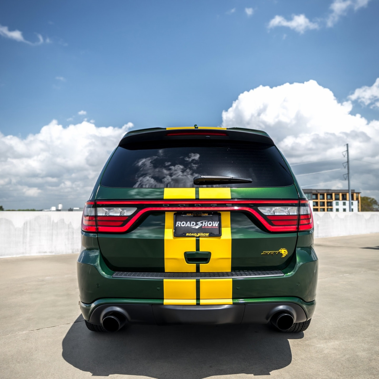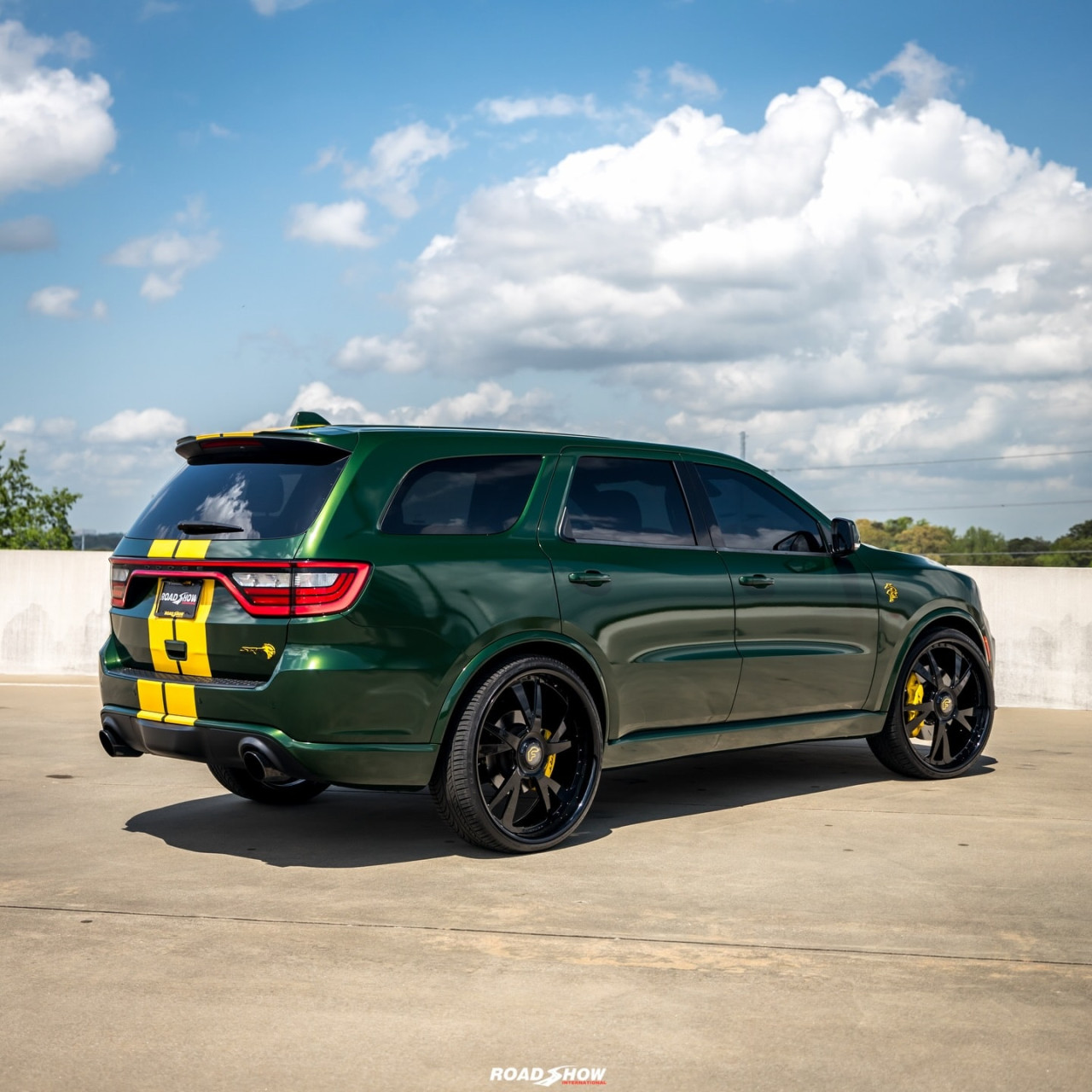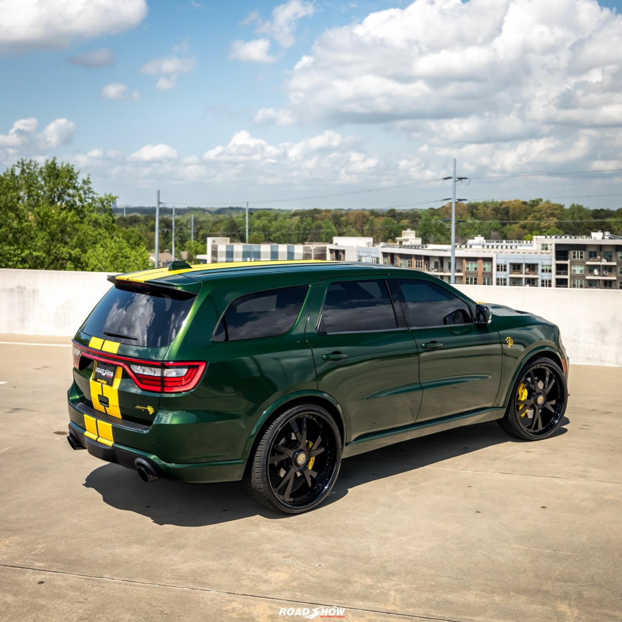 Примерът идва от Road Show International в Атланта, Джорджия, с техния Dodge Durango SRT Hellcat RS Edition. Моделът се отличава със Spruce Green каросерия, комбинирана с ясно видими жълти състезателни ивици. В салона доминират черна и тъмночервена кожа.