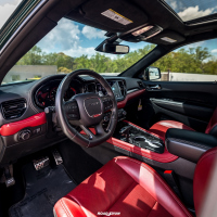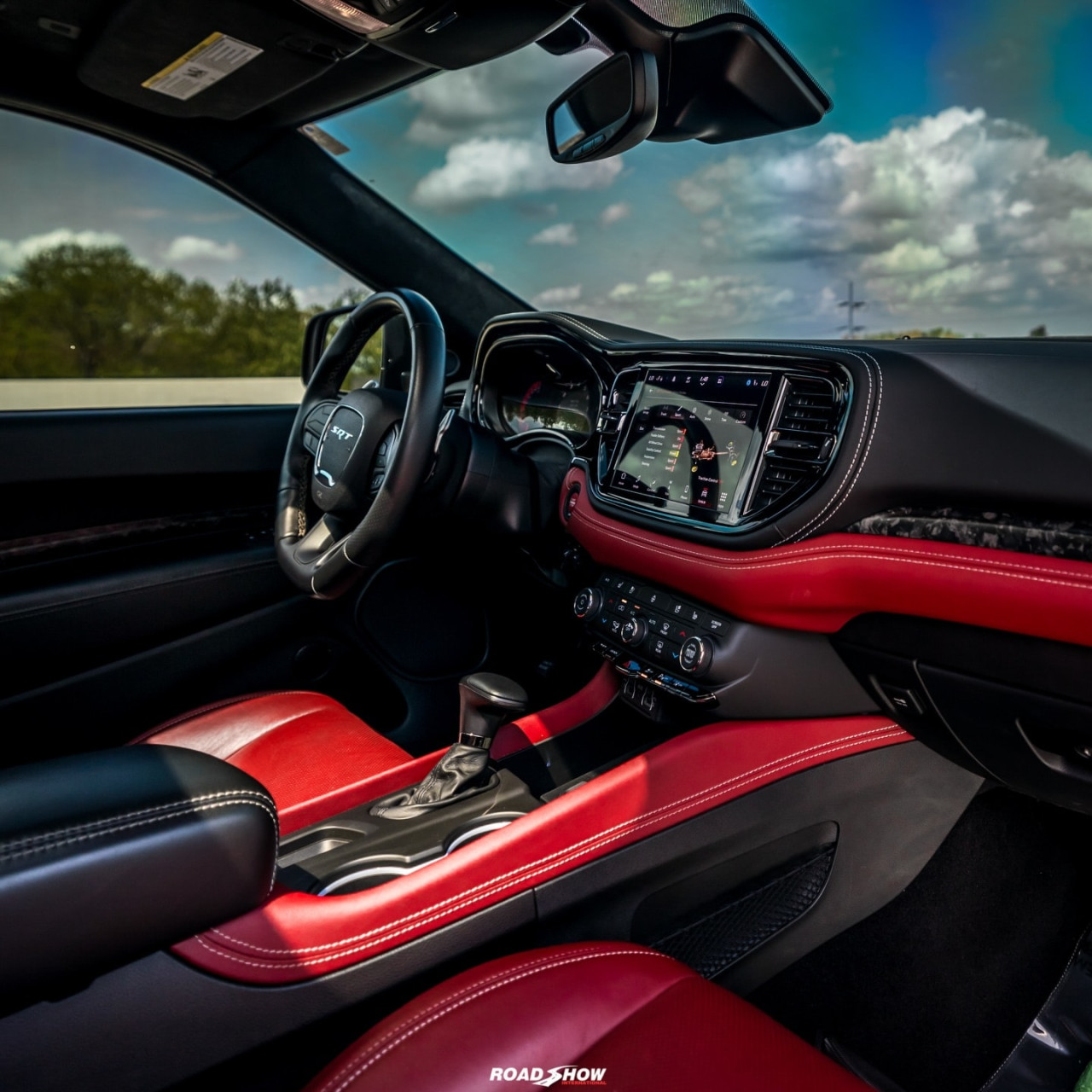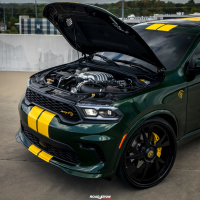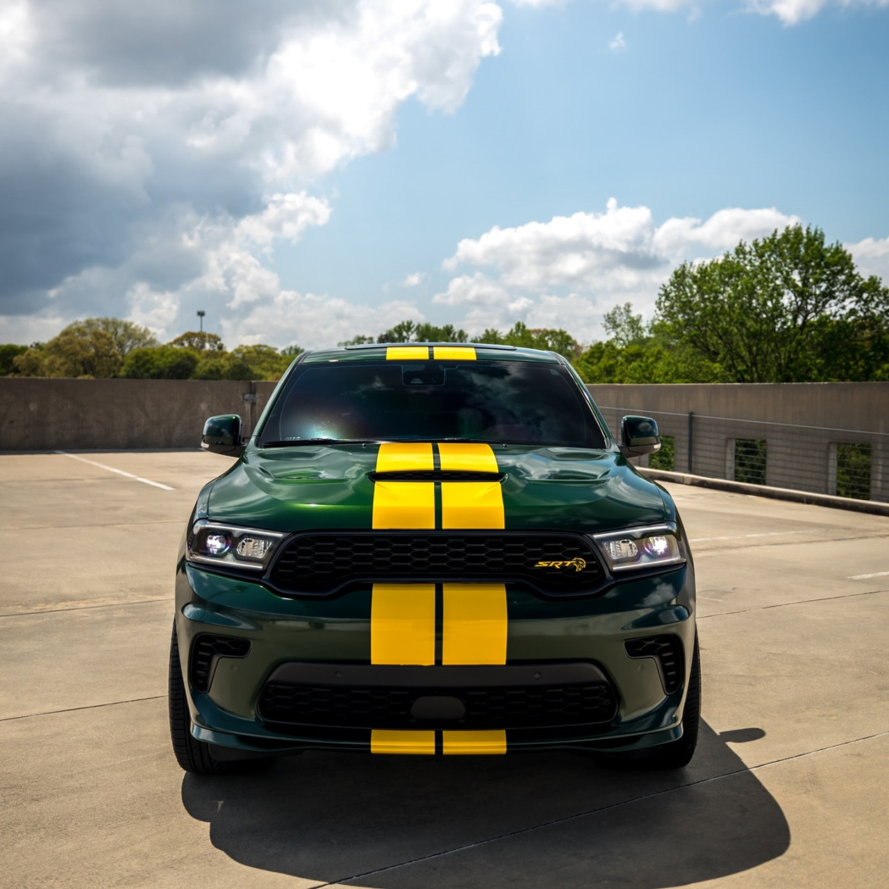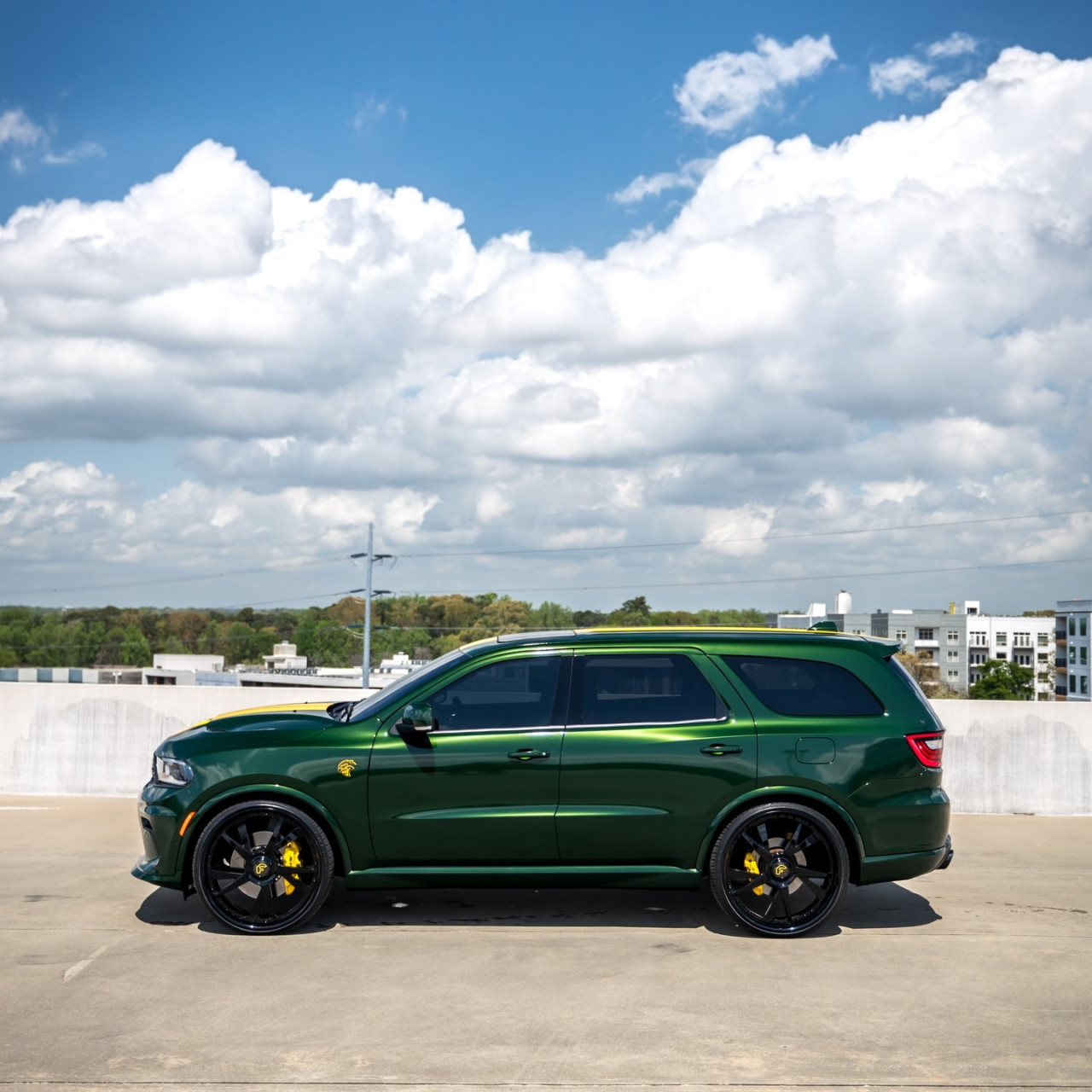 Примерът идва от Road Show International в Атланта, Джорджия, с техния Dodge Durango SRT Hellcat RS Edition. Моделът се отличава със Spruce Green каросерия, комбинирана с ясно видими жълти състезателни ивици. В салона доминират черна и тъмночервена кожа.