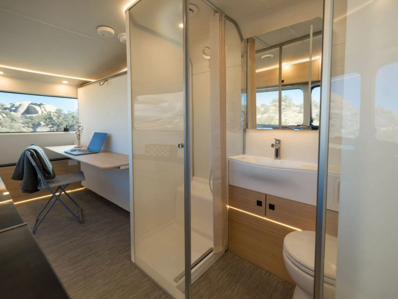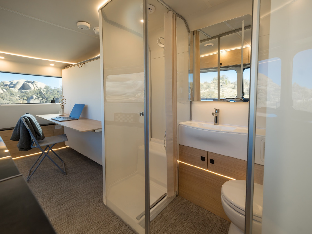 Банята е „dry“ тип, с премиум изпълнение, включително 3-степенна мацераторна тоалетна, икономичен душ и електрохромни стъклени стени. Всъщност цялото стъкло в Pebble Flow е електрохромно и може да се управлява — по зона, по прозорец или за цялото ремарке — през приложението Pebble. Системата позволява превключване между прозрачно и непрозрачно, като отпада нуждата от щори за уединение.