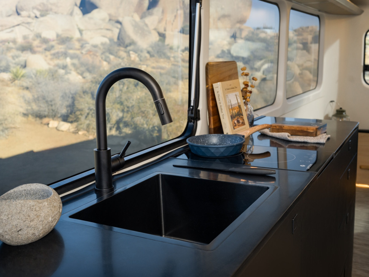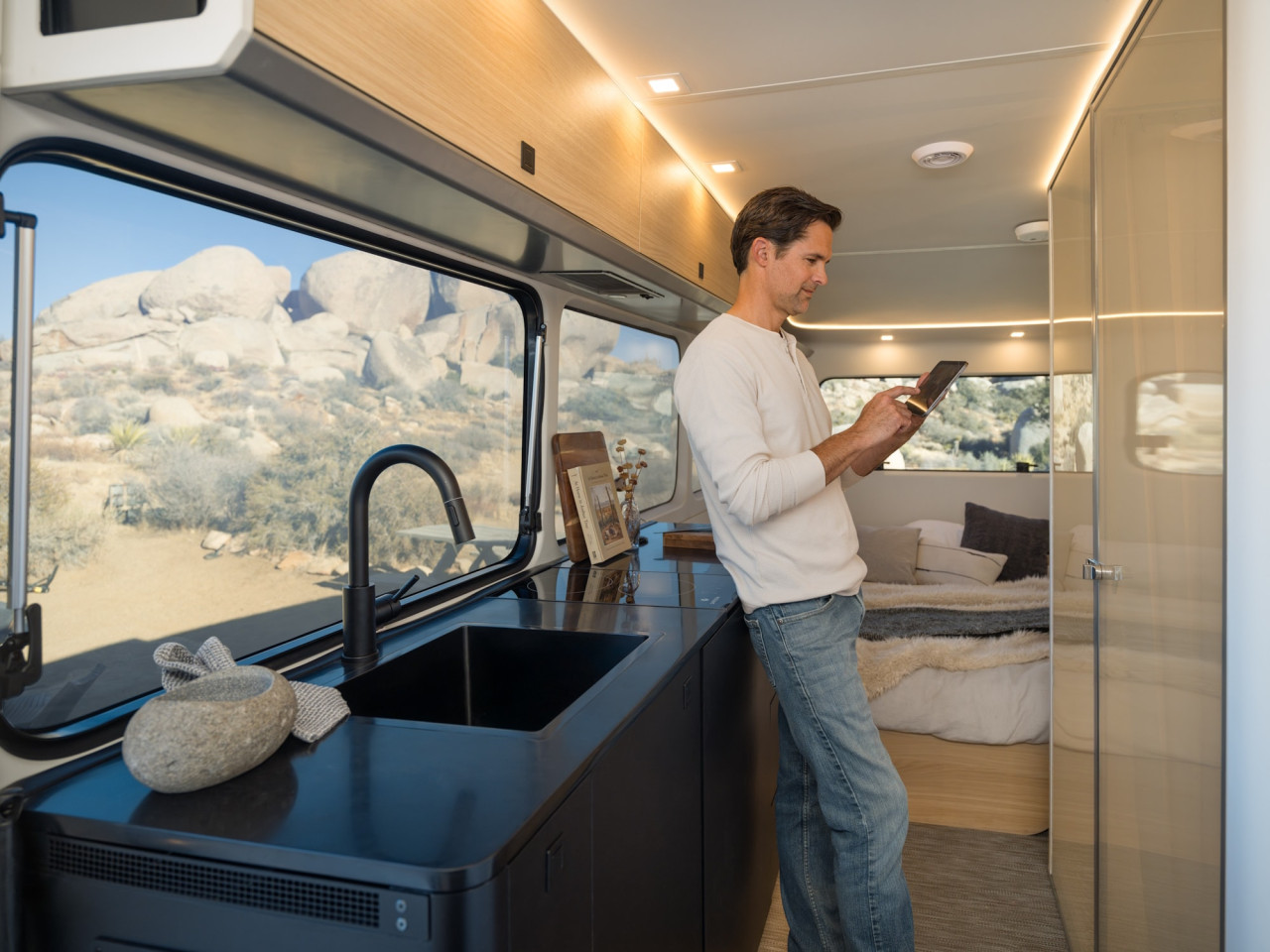 Кухнята и банята са разположени в централната част и заемат ширината на ремаркето. Кухнята включва двузонов индукционен котлон, който може да се изважда за готвене навън, голяма мивка, работен плот и шкафове над и под плота.