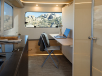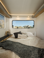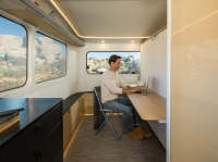 Ремаркето е проектирано за четирима души, с две зони за спане в двата края. Едната е отделение, което служи и като мобилен офис, а леглото е скрито — тип Murphy bed, което се спуска вечер. Pebble е проектирала бюрото и леглото така, че леглото да може да се спусне без предварително разчистване на бюрото, като според видеото самото бюро се движи заедно с механизма.