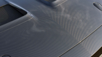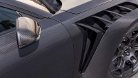 Всяко външно панелче е от карбон, включително вратите, където металът е заменен със свързан въглероден композит. Оплетката е подравнена по централната линия, минавайки през капака, покрива, задното крило и „ducktail“ спойлера. Резултатът е визуално единство, което подчертава инженерната прецизност.