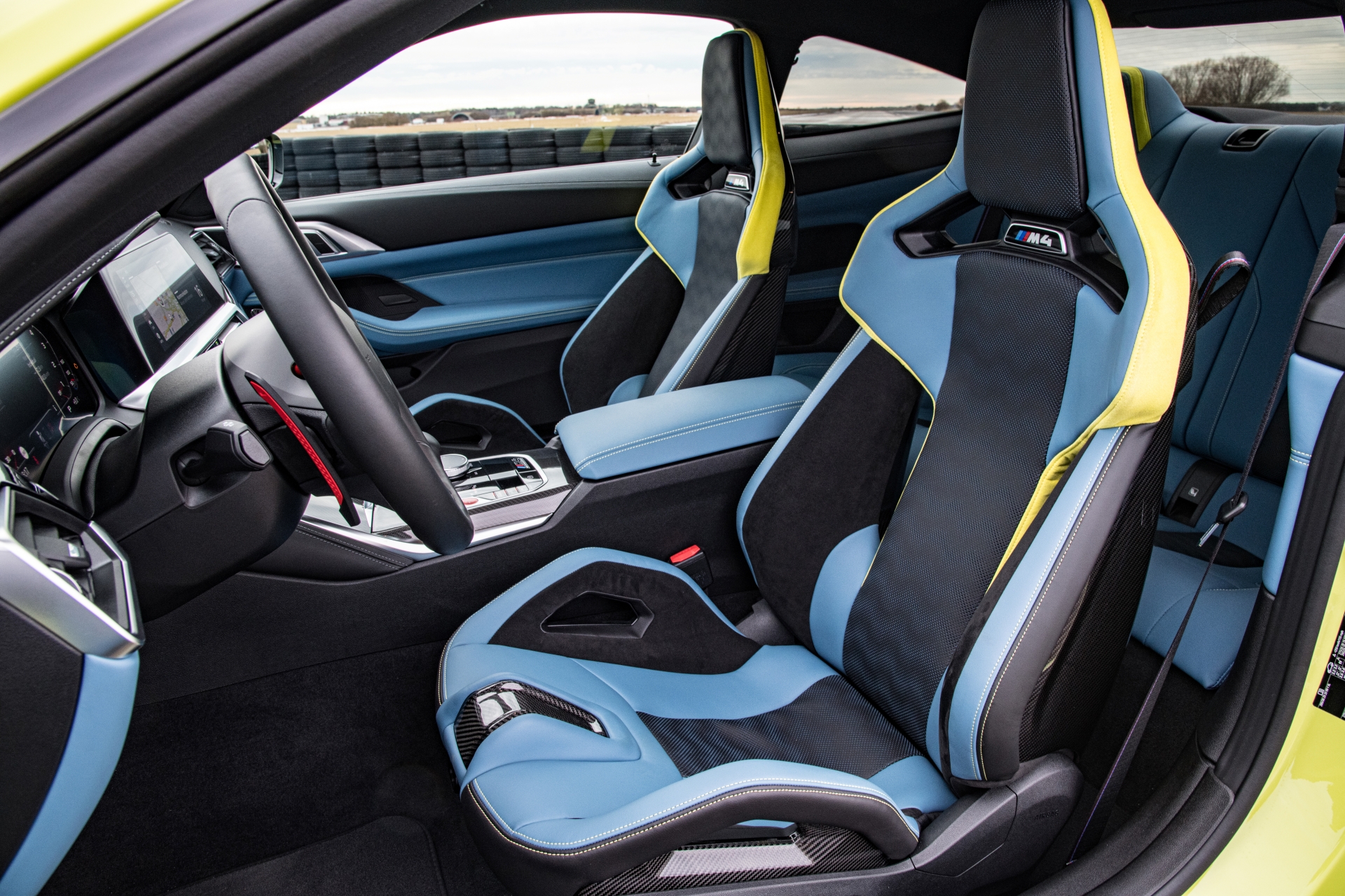 Стандартните М спортни седалки с интегрирани облегалки за главите са разположени ниско, а предлаганите допълнително олекотени и още по-ниско разположени коритообразни карбонови седалки стягат тялото допълнително и дават възможност както за демонтаж на облегалките, когато карате с каска, така и за използването на допълнителни многоточкови предпазни колани.