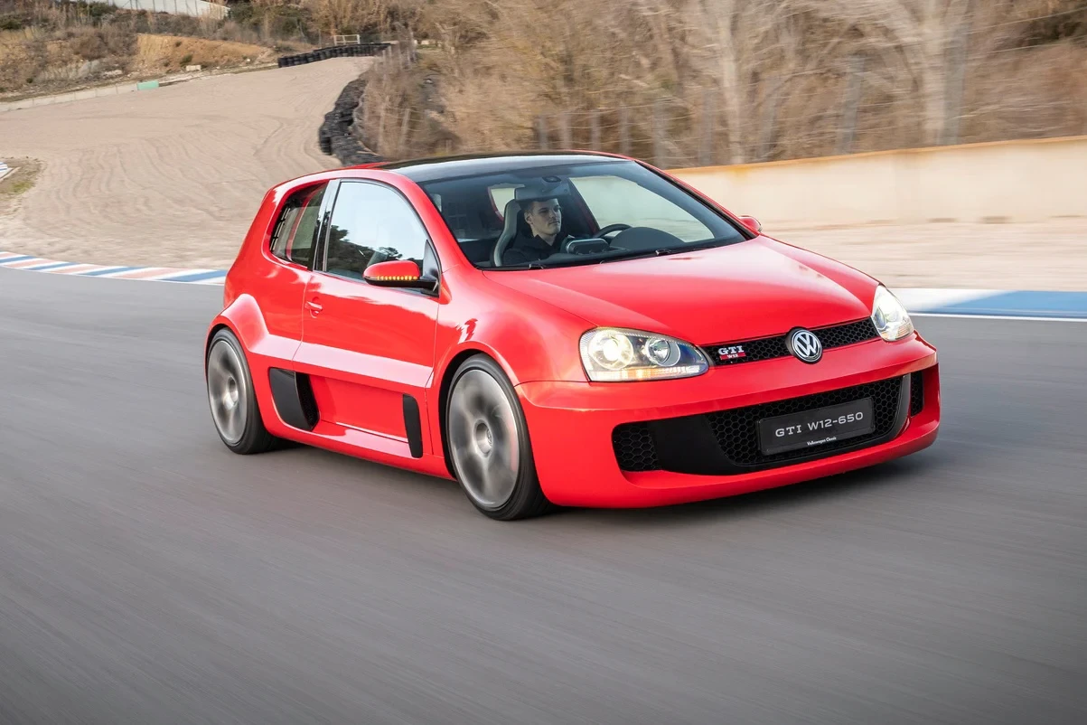 По повод 50-годишнината марката припомня три радикални концепта, които изкарват GTI далеч отвъд традиционното предно предаване. Първият е легендарният Volkswagen Golf GTI W12-650, показан през 2007 г. С централно разположен 6,0-литров W12 двигател от Bentley, мощност 650 к.с. и максимална скорост над 320 км/ч, този „супер Golf“ комбинира компоненти от Lamborghini Gallardo, Audi RS4 и VW Phaeton. Проектът е създаден в ерата на Фердинанд Пиех – човекът зад Bugatti Veyron – и демонстрира докъде може да стигне емблемата GTI.