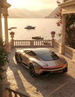 Каросерията носи Panamericana решетка с голяма звезда. Фаровете са издължени, но без звездния мотив. Виждат се скрити дръжки, тънки огледала и отвори зад калниците. Агресивни прагове и големи въздухозаборници доминират профила. Покривът плавно се снижава към аркаден заден прозорец. Тънка LED лента отзад подсилва футуристичния облик. Дизайнът се допълва от многоспицови джанти.