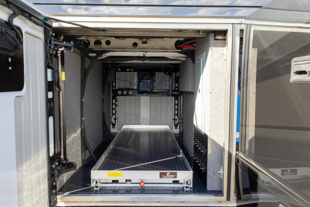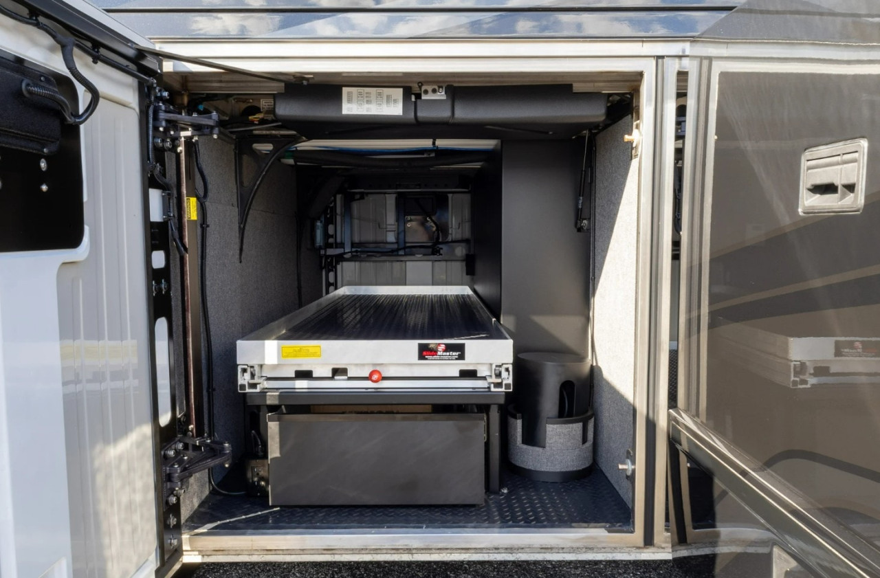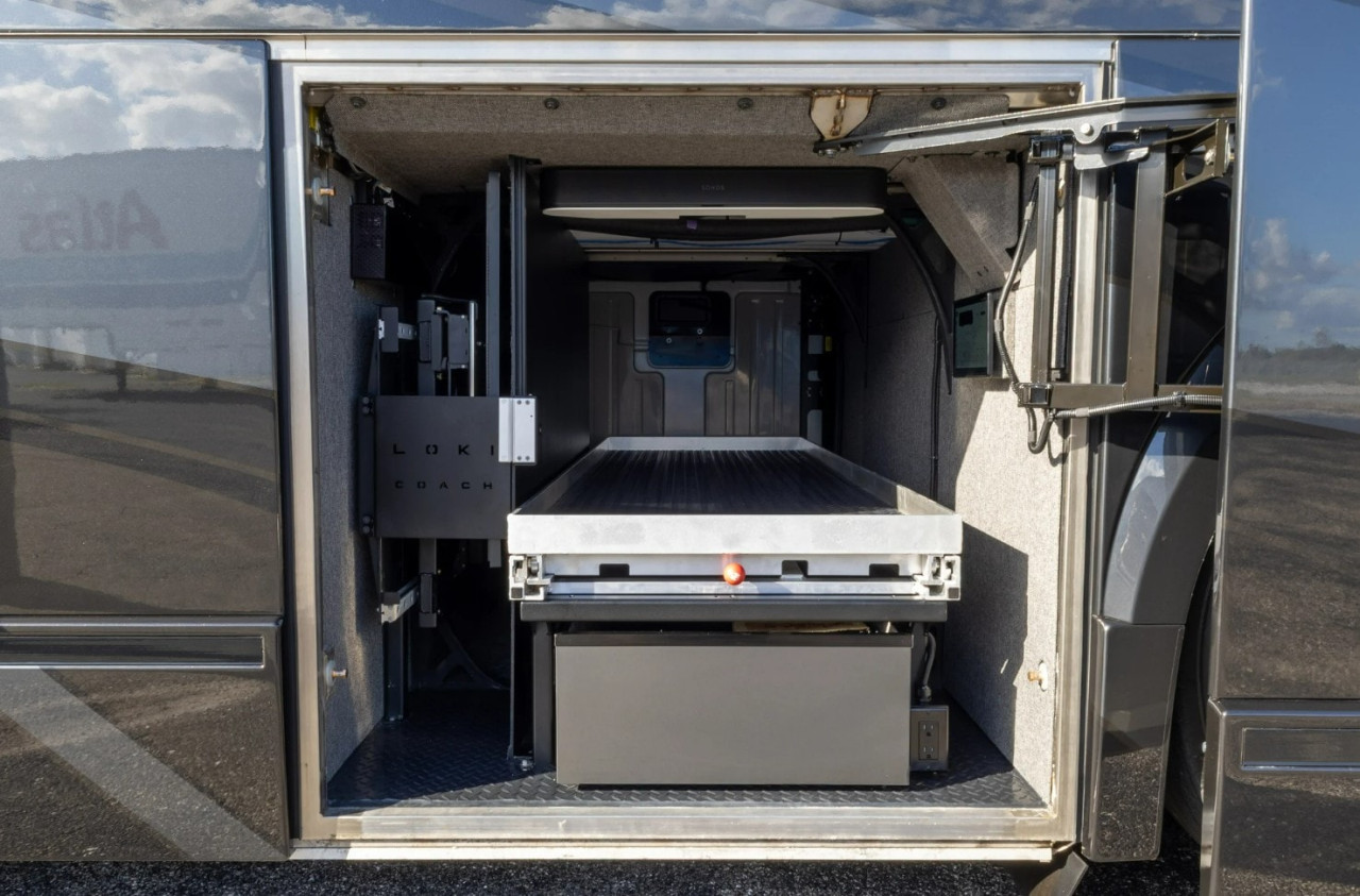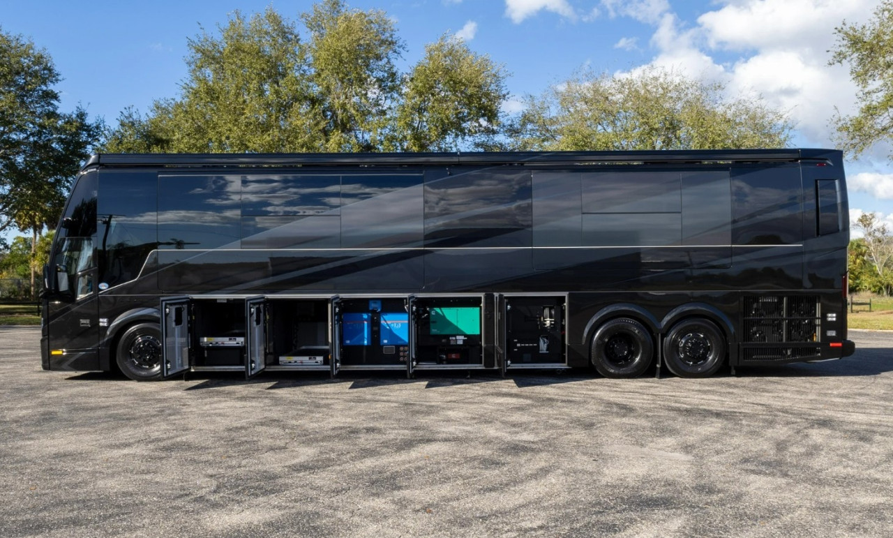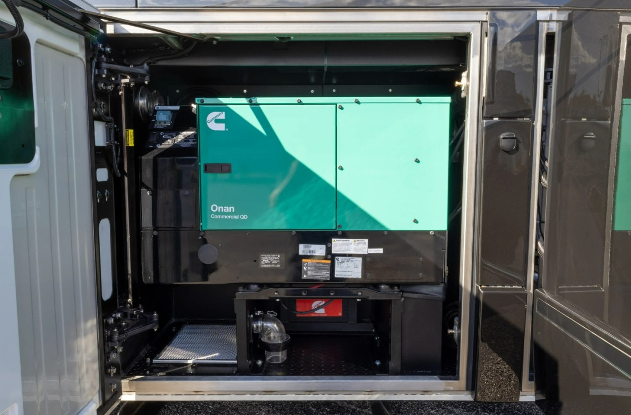 Отвън са описани два проходни багажни отсека с тежкотоварни алуминиеви изтеглящи се платформи, още един смарт телевизор в отделен отсек, външна кухня и сервизни отделения. Посочени са генератор Onan Cummins, енергийна система Victron и соларни панели 400 W на покрива.