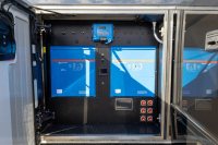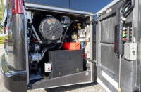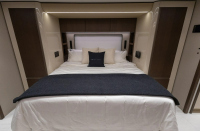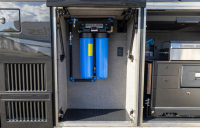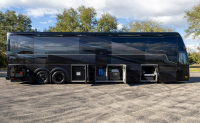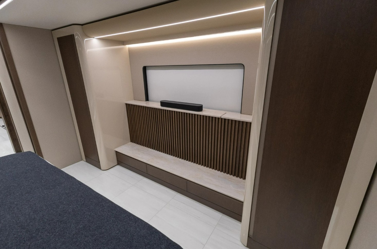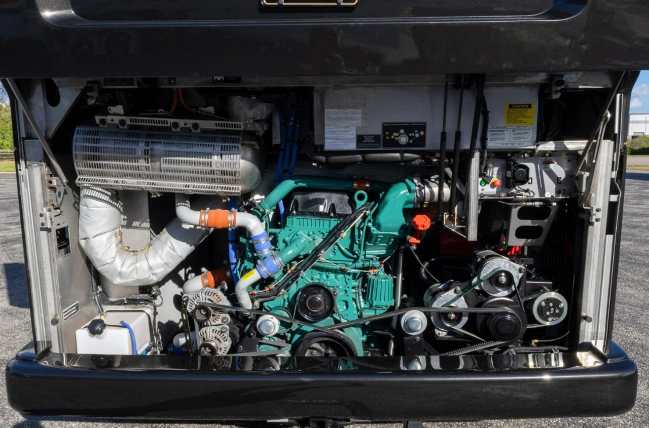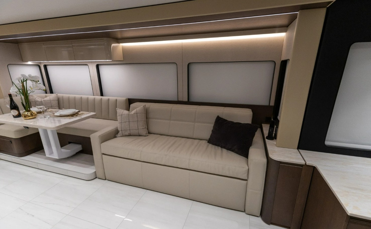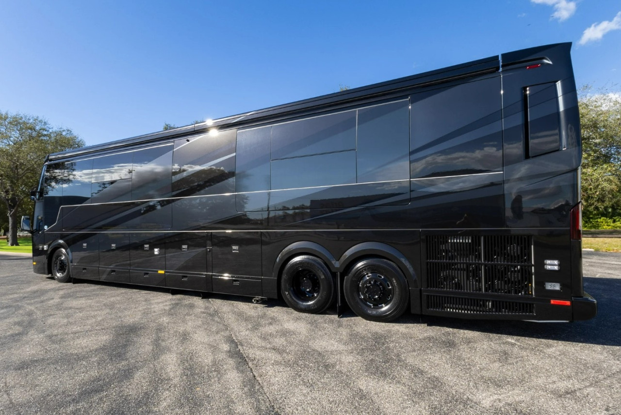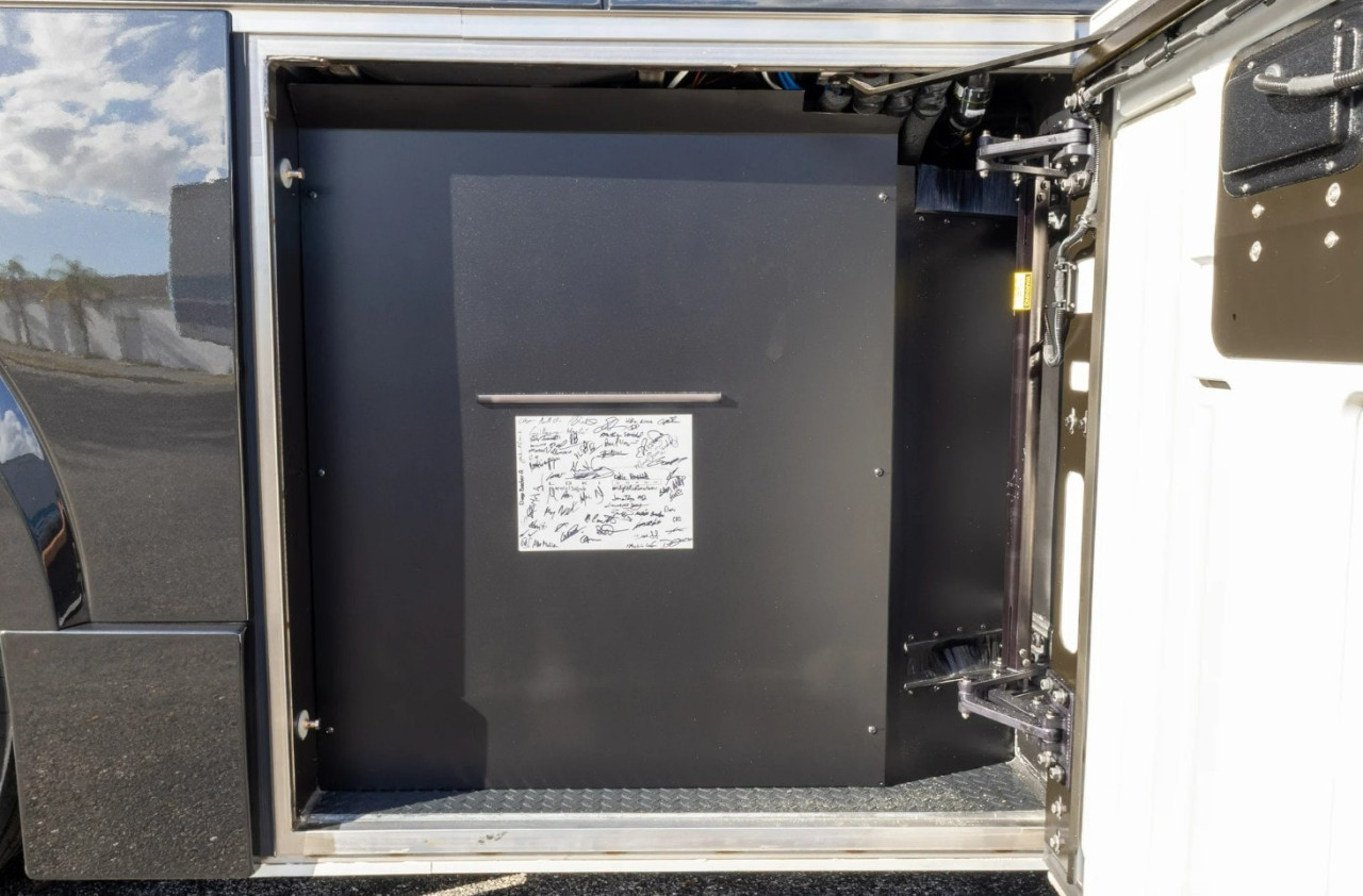 Отвън са описани два проходни багажни отсека с тежкотоварни алуминиеви изтеглящи се платформи, още един смарт телевизор в отделен отсек, външна кухня и сервизни отделения. Посочени са генератор Onan Cummins, енергийна система Victron и соларни панели 400 W на покрива.