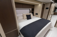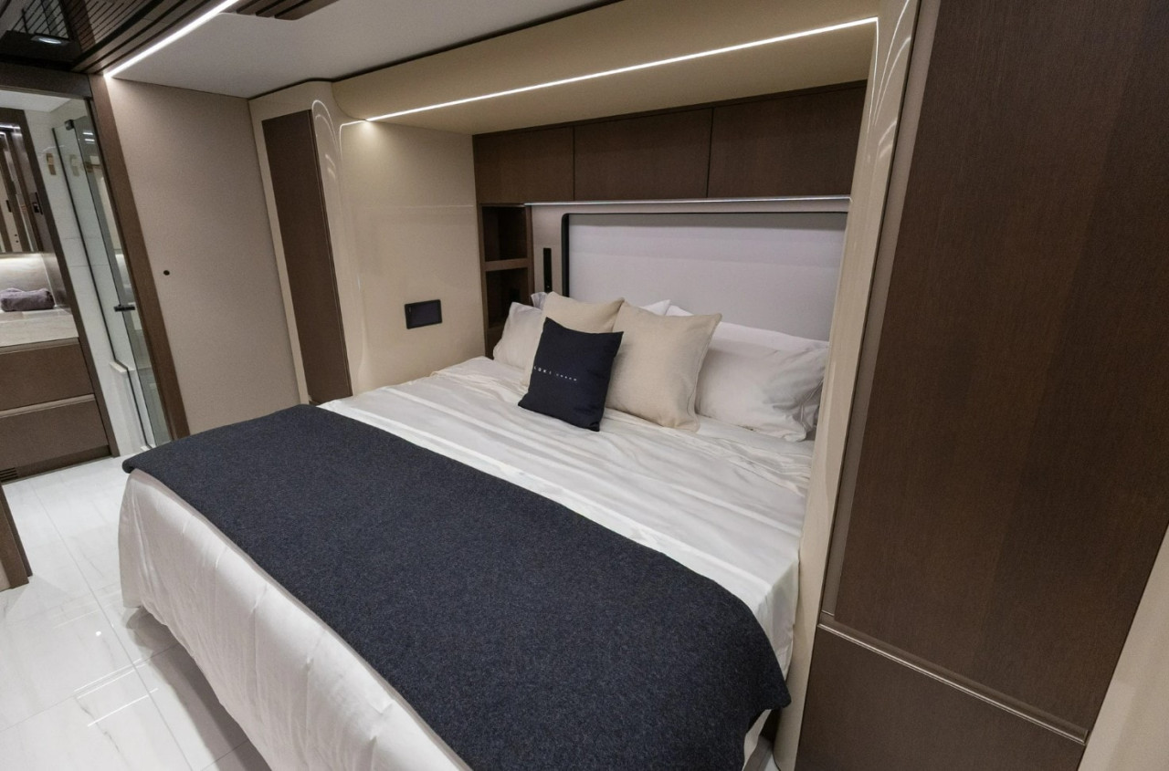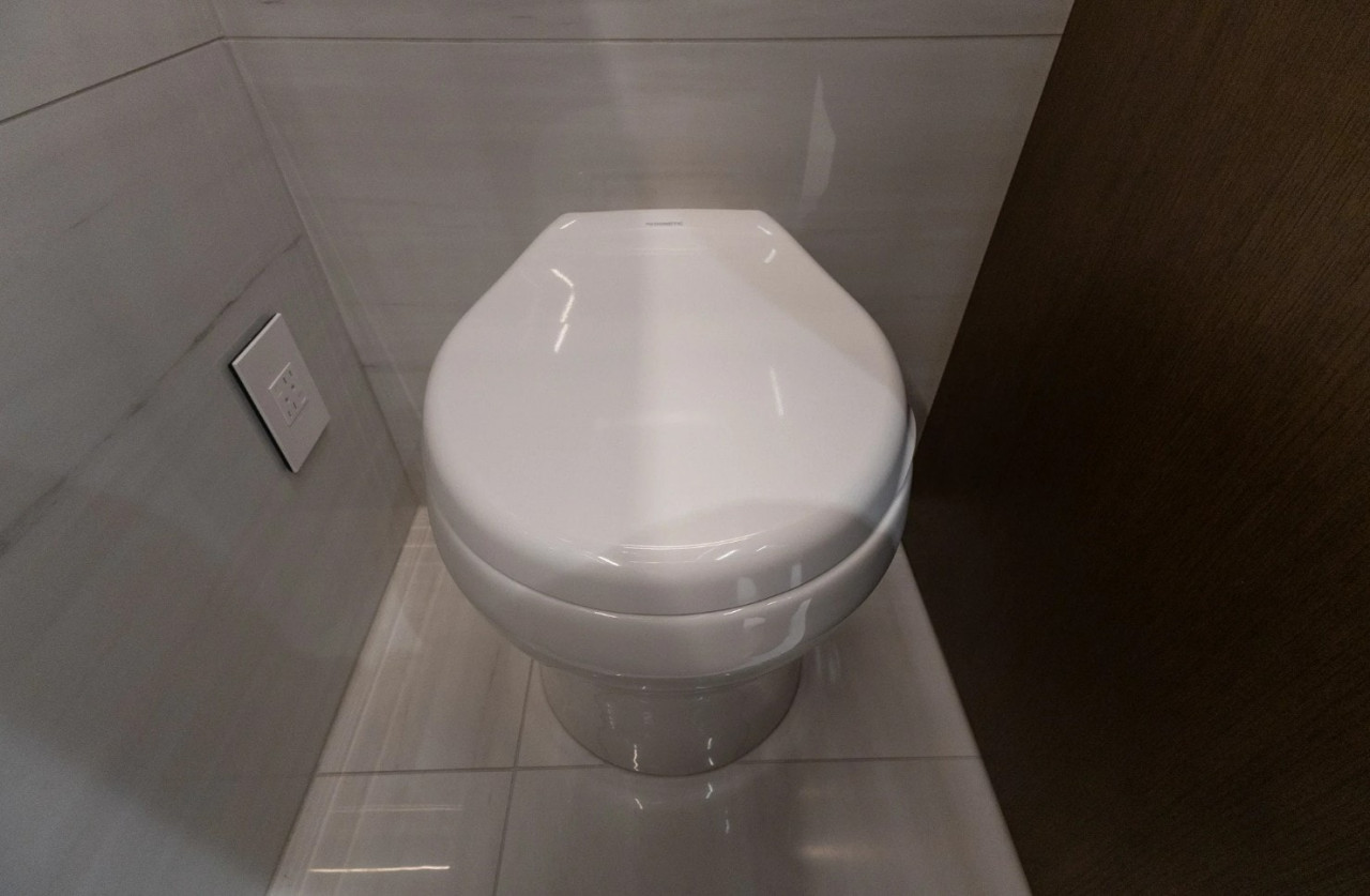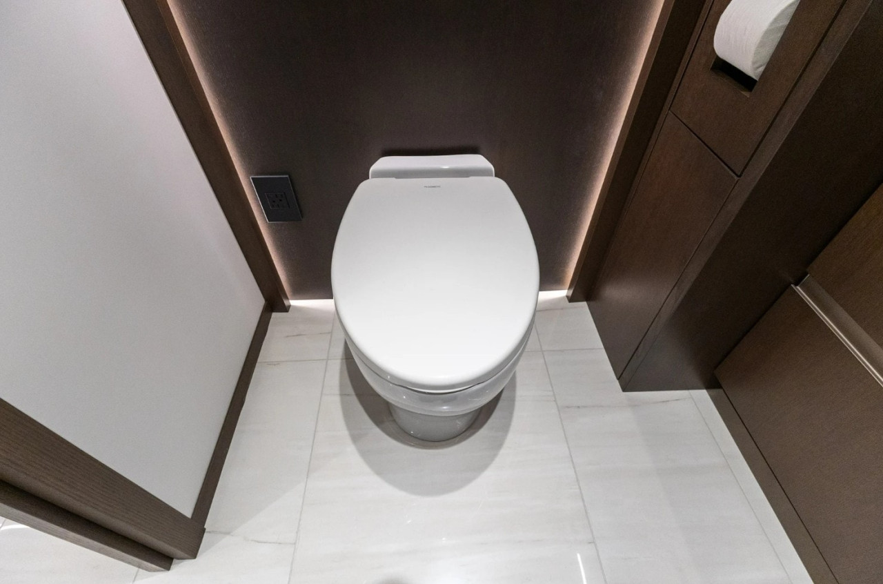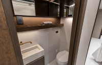 Половин банята е разположена по коридора към основната спалня и се достъпва чрез пневматична електрическа врата. Оборудването включва каменна мивка, огледални шкафове и порцеланова тоалетна с мацератор. Срещу нея има втората и по-голяма килерна зона, кафе станция и, зад прибиращи се врати, перално помещение със стек пералня и сушилня с „домашен“ размер.