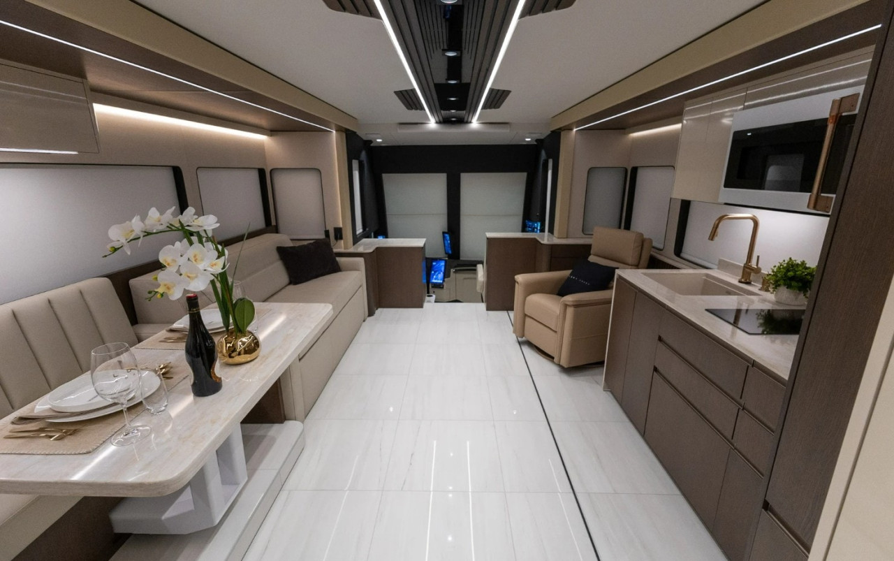 Екстериорът е изцяло черен и е допълнен от непрекъсната LED светлинна линия по каросерията. Вътрешното разпределение включва основна спалня, домашен офис, салон, отделна зона за хранене и минималистична кухня.