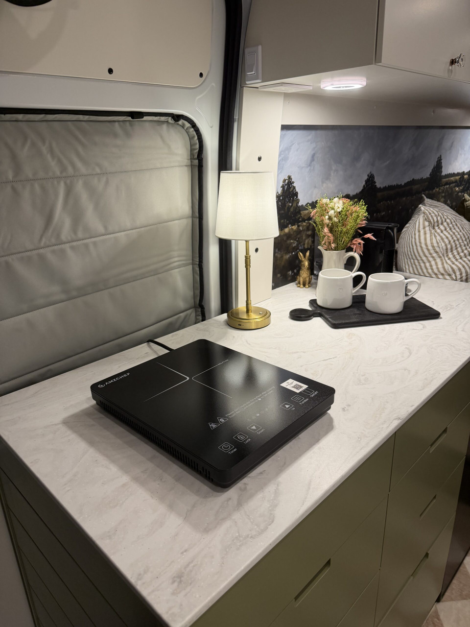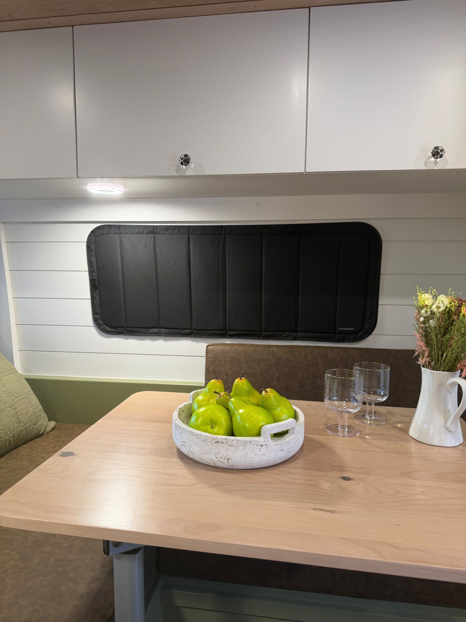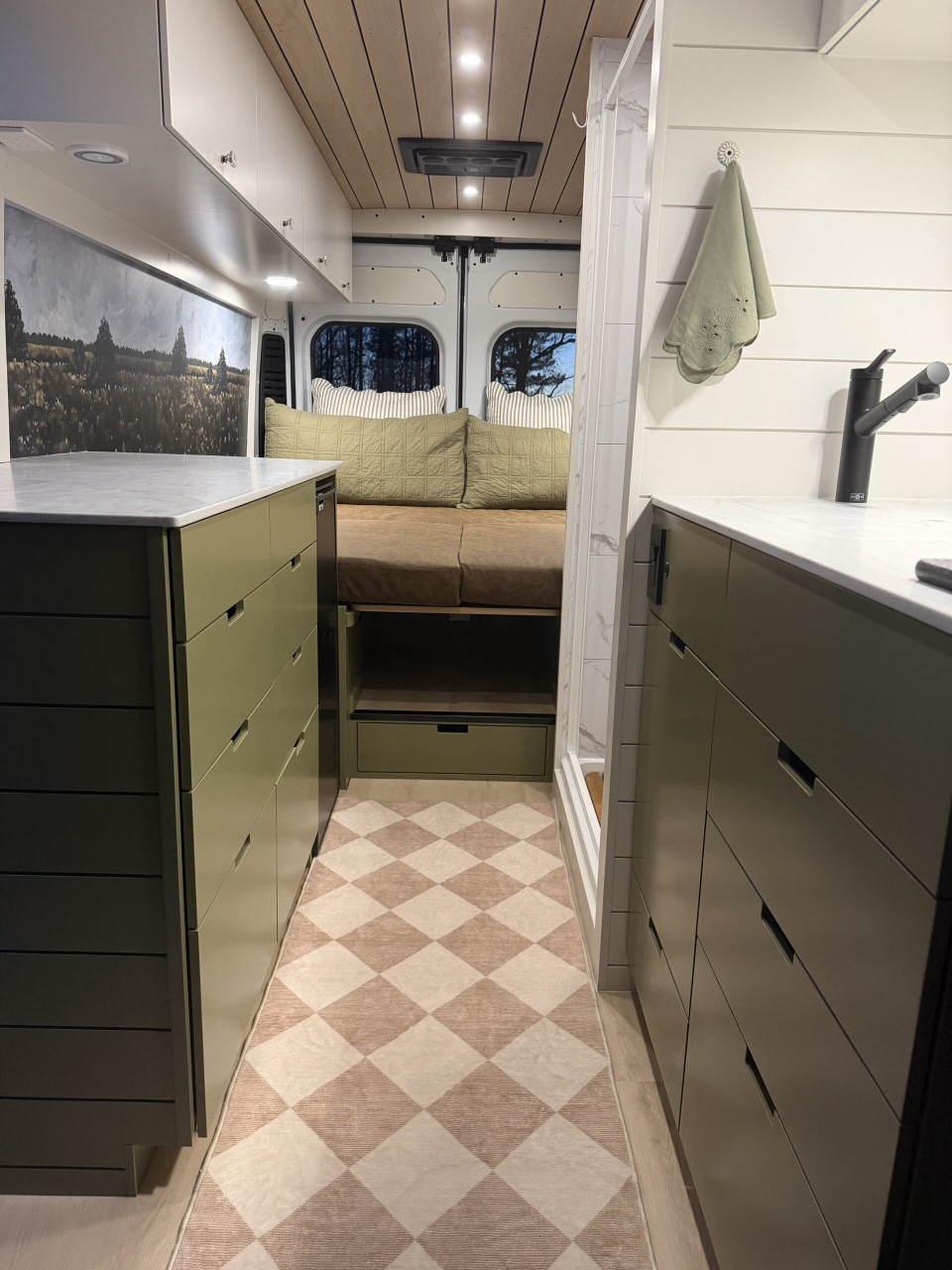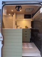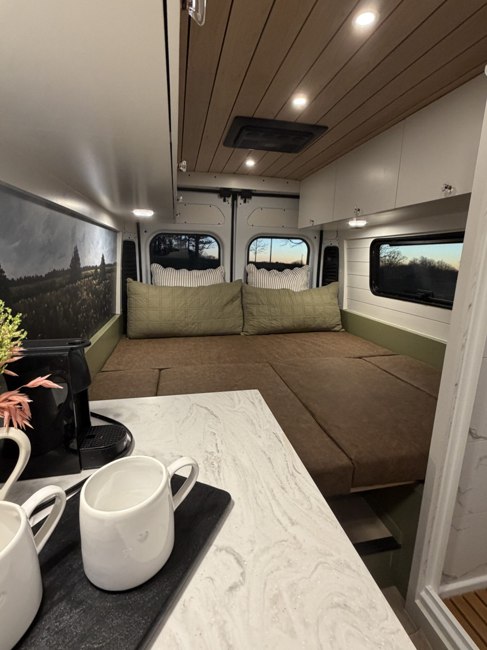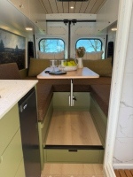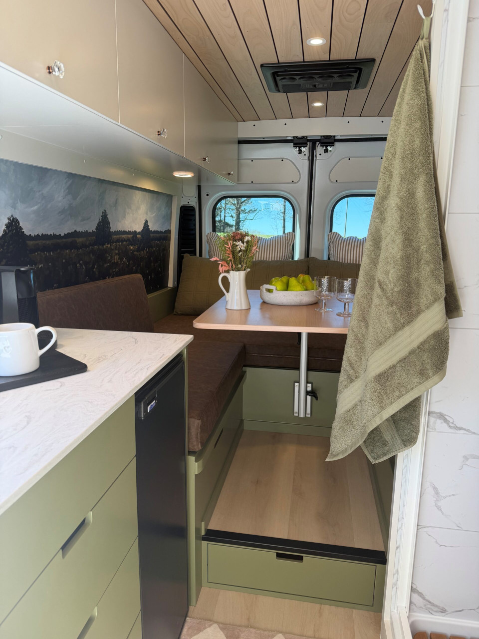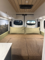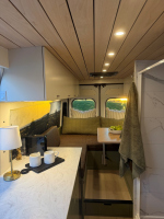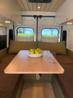 Ivy залага на дискретен външен вид – без шарки и крещящ дизайн, което го прави идеален за т.нар. „стелт къмпинг“ в градска среда. В същото време вътре картината е съвсем различна – луксозен интериор с дървени панели, винилов под и модерни шкафове в зелено и кафяво. Разпределението е мислено за двама души – с U-образен салон, който се превръща в легло, напълно оборудвана кухня и дори вътрешна баня. Има и „гараж“ отзад за багаж, което го прави практичен за дълги пътувания.
