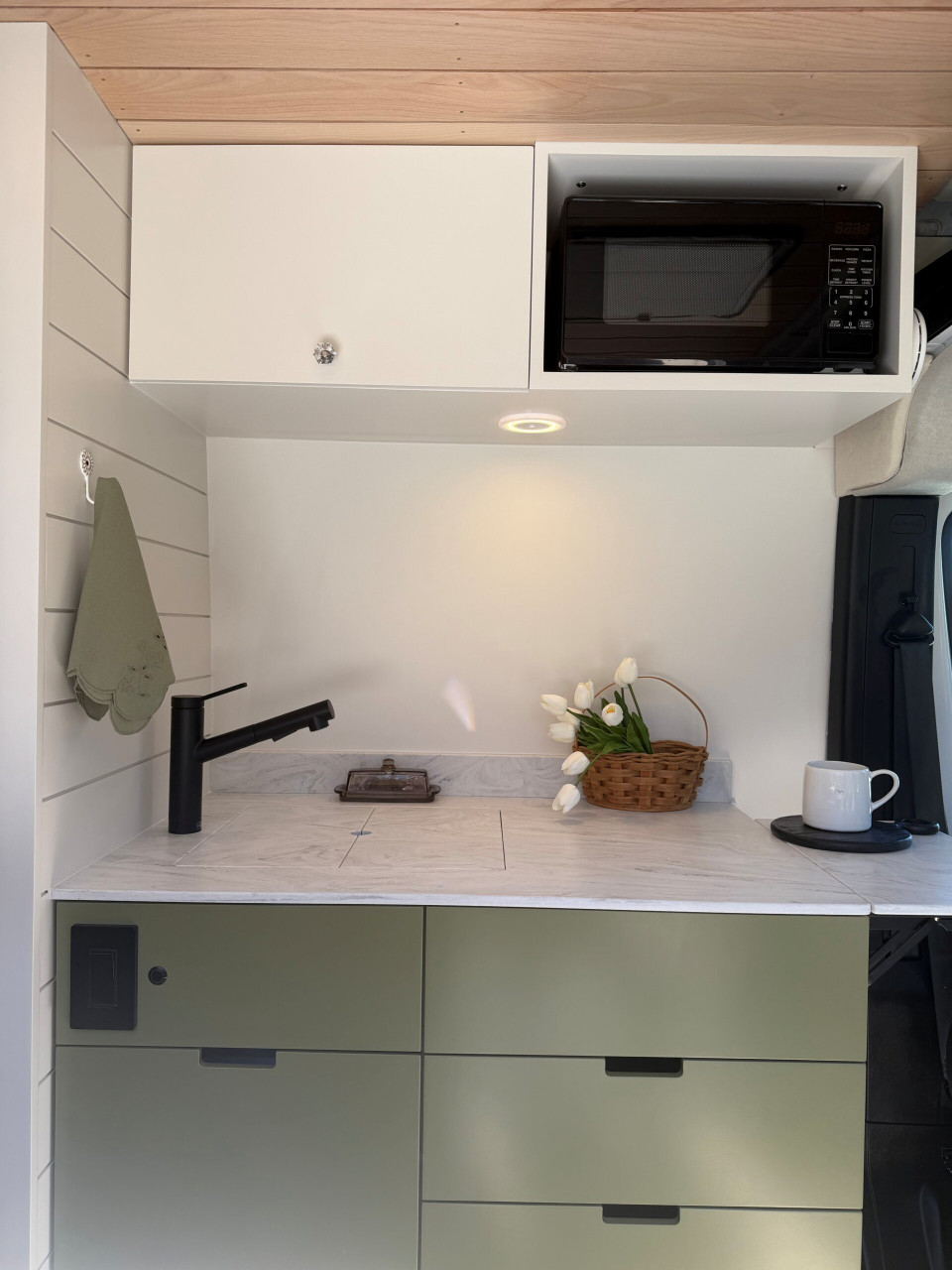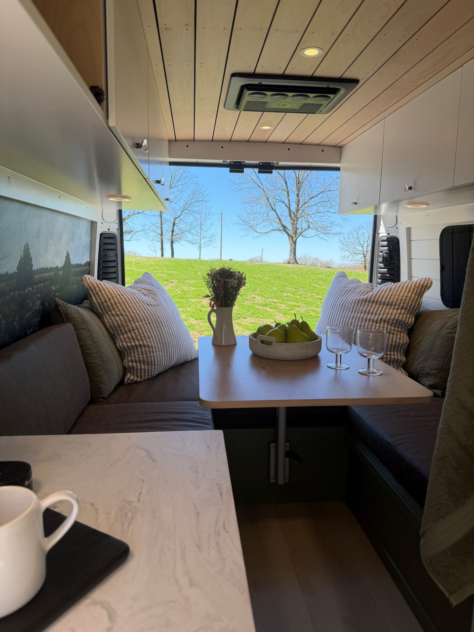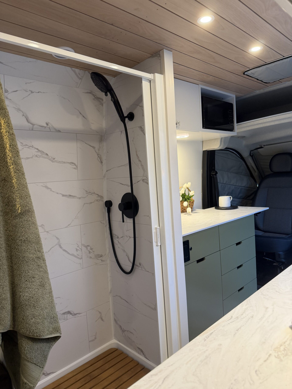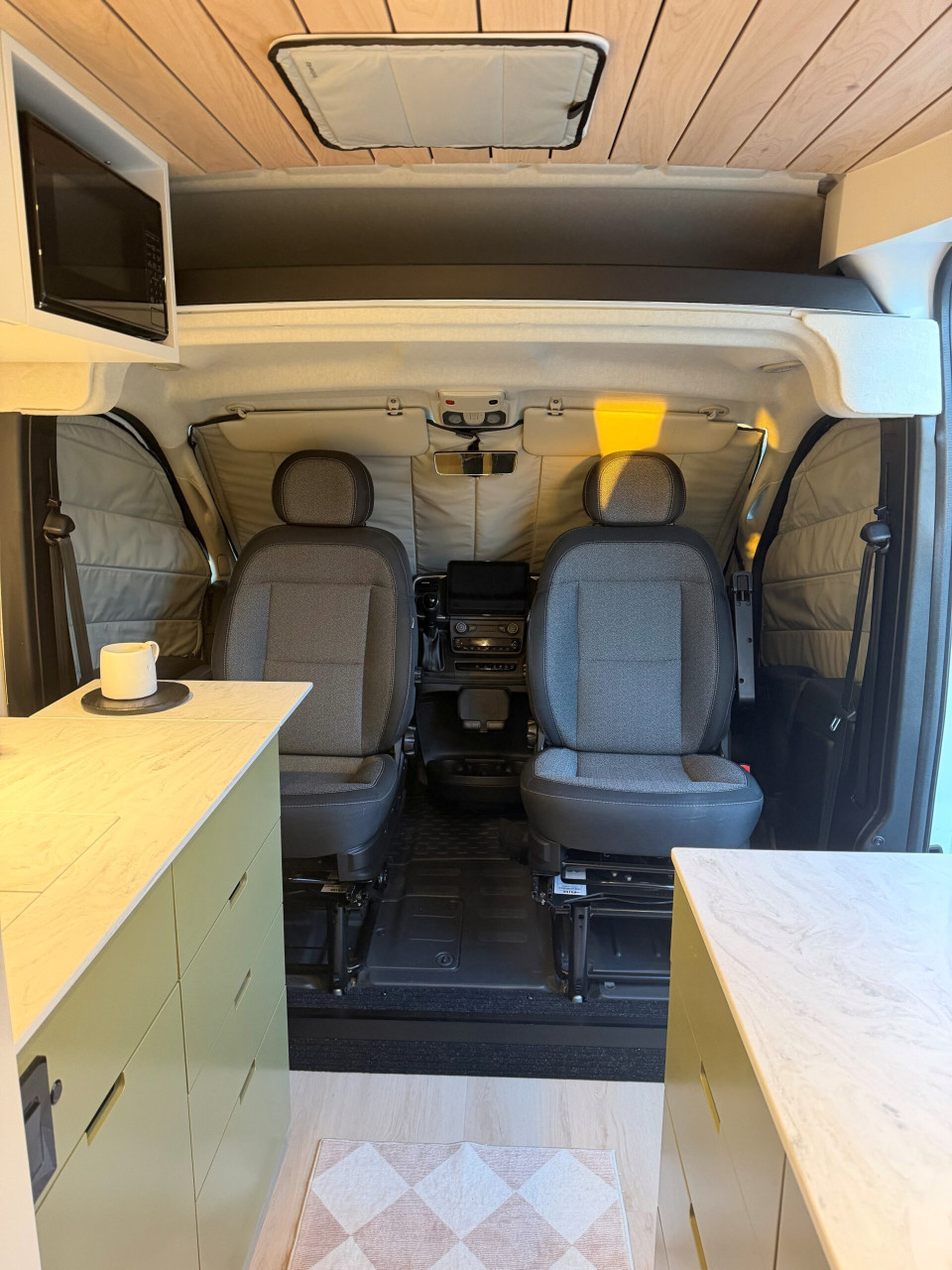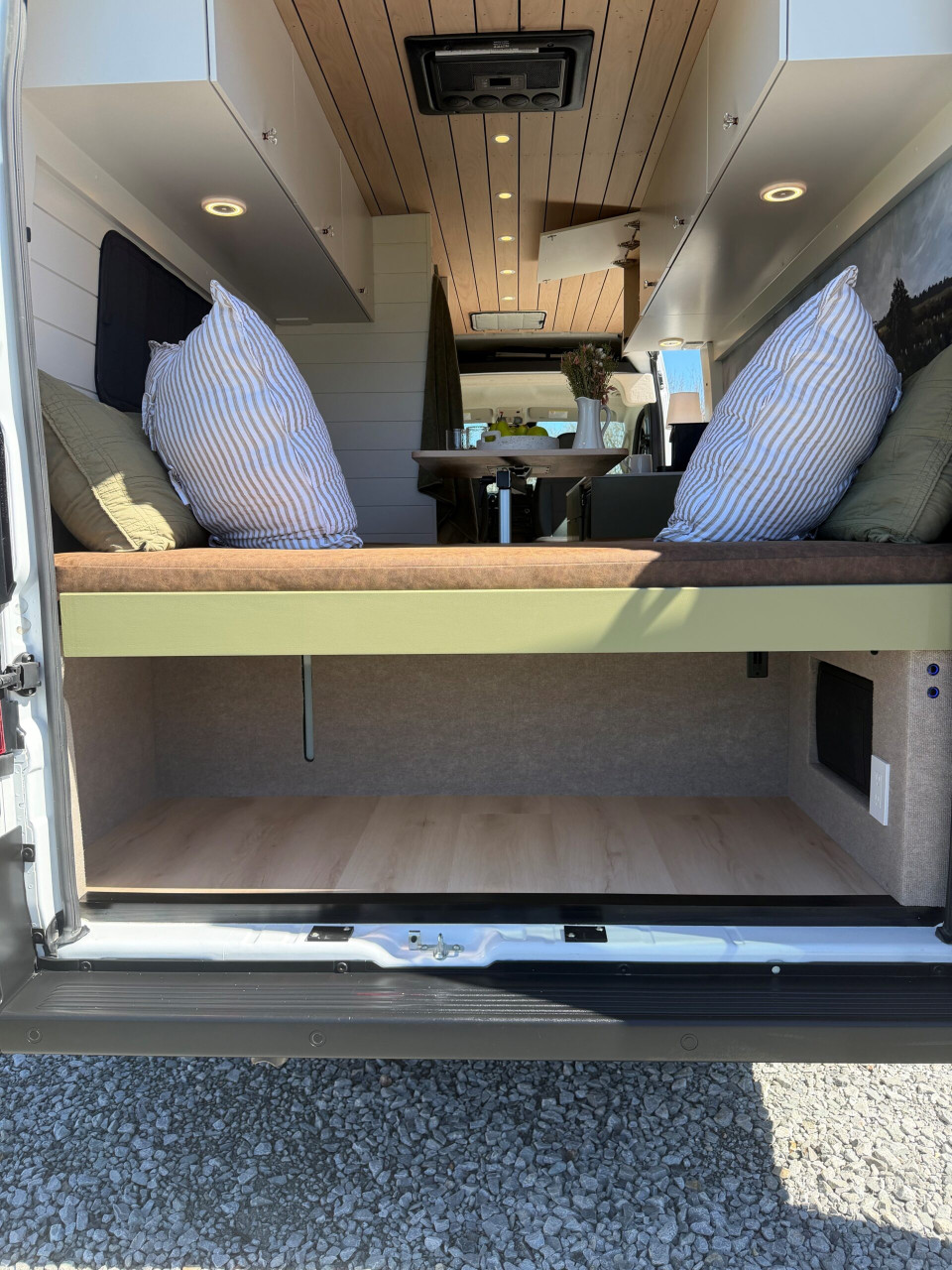 Ivy залага на дискретен външен вид – без шарки и крещящ дизайн, което го прави идеален за т.нар. „стелт къмпинг“ в градска среда. В същото време вътре картината е съвсем различна – луксозен интериор с дървени панели, винилов под и модерни шкафове в зелено и кафяво. Разпределението е мислено за двама души – с U-образен салон, който се превръща в легло, напълно оборудвана кухня и дори вътрешна баня. Има и „гараж“ отзад за багаж, което го прави практичен за дълги пътувания.