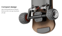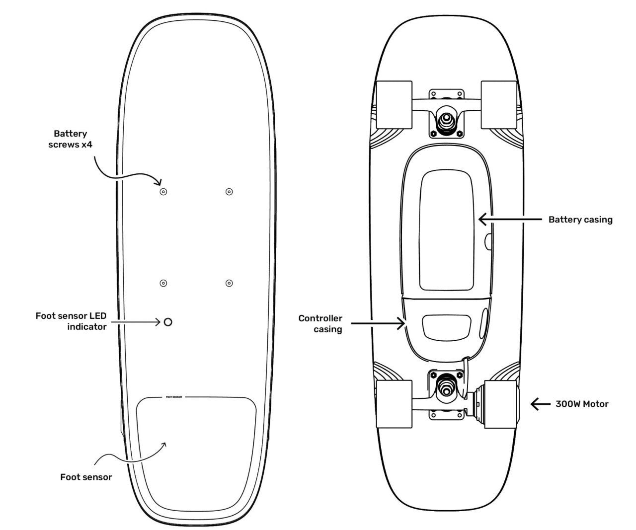 След натискане бутонът подава сигнал към моторите, които започват плавно и равномерно ускорение до максималната скорост от 30 км/ч. За спиране е достатъчно кракът да се вдигне – подаването на мощност спира, а забавянето се извършва по познатия начин чрез пренасяне на тежестта към опашката на дъската. Предвидени са и защитни падове отдолу, за да се предпази конструкцията при „опиране“ в асфалта. Разбира се, остава възможността за класическо спиране с крак или със слайд, ако каращият разполага с нужните умения.