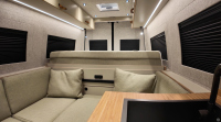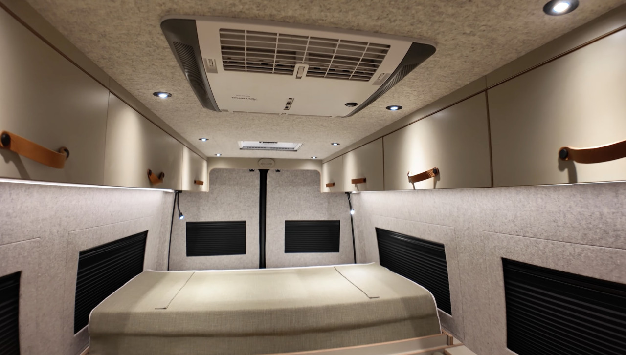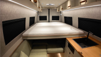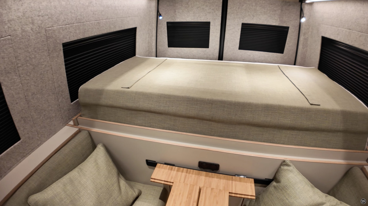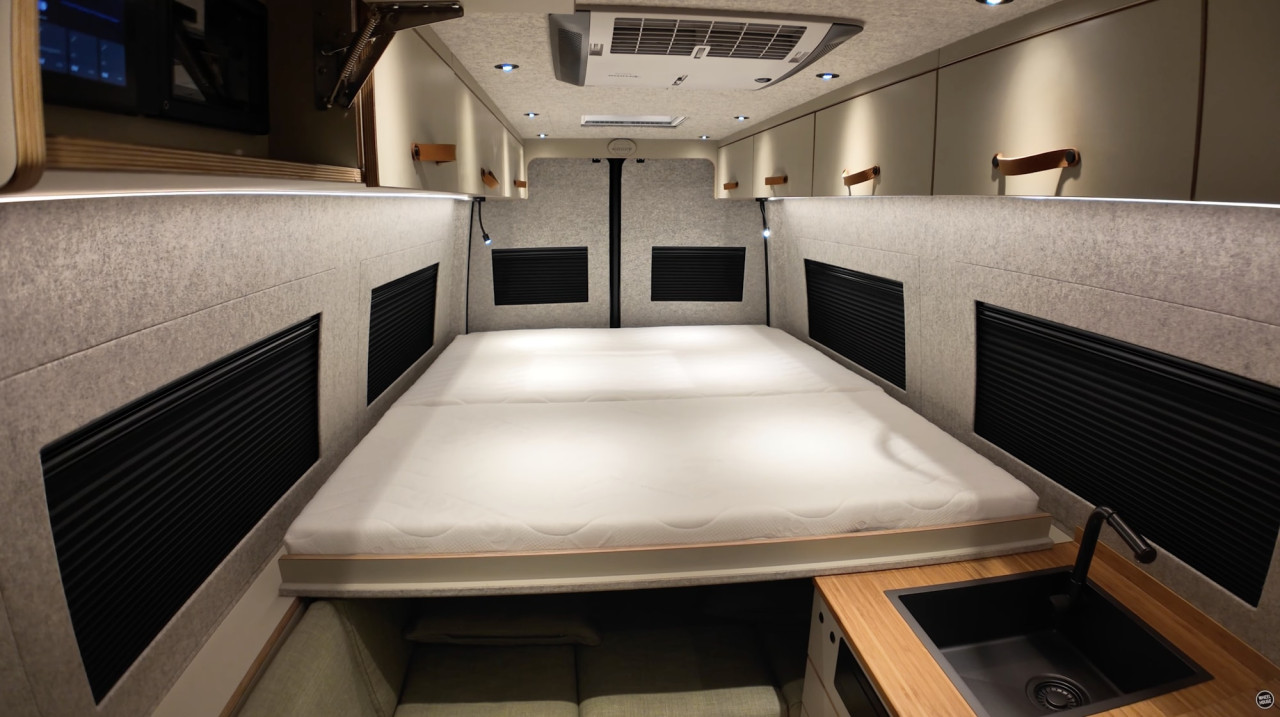 Една от причините е модулният интериор. MareCamper използва патентована система за легло на Wheel House, която оставя повече място през деня за динет или зона за отдих. В дневен режим леглото е „наполовина“ и е окачено над задния гараж.