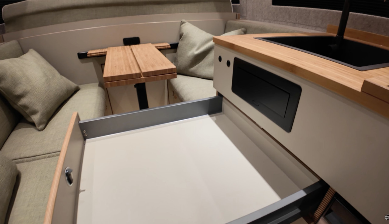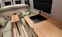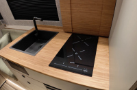 Кухнята е разположена от страната на водача и включва черна неръждаема мивка и двукотлонен индукционен плот Thetford, скрит под капак с магнитни фиксатори. Капакът служи като работен плот, когато котлоните не се използват.