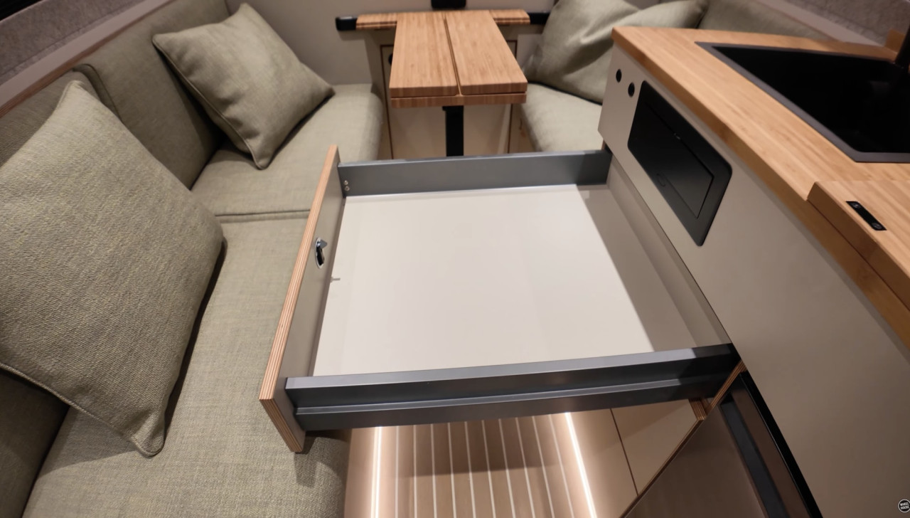 Под плота има компактен хладилник с подвижен фризер и дълбоки чекмеджета. Допълнителни места за багаж са разположени от двете страни на вана, включително осветени шкафове с филцова облицовка и кожени дръжки, както и пространство под пейките.