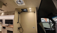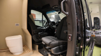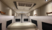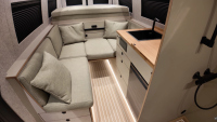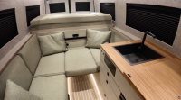 При показаната конфигурация има подгрявана душ-ваничка, настилка от композитен декинг, използван в яхтената индустрия, черен обков и касетъчна тоалетна.