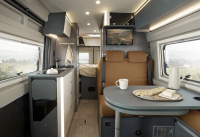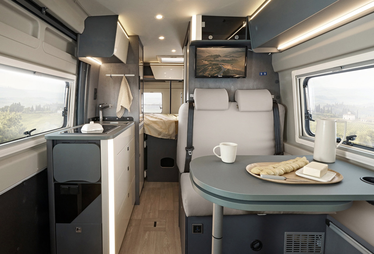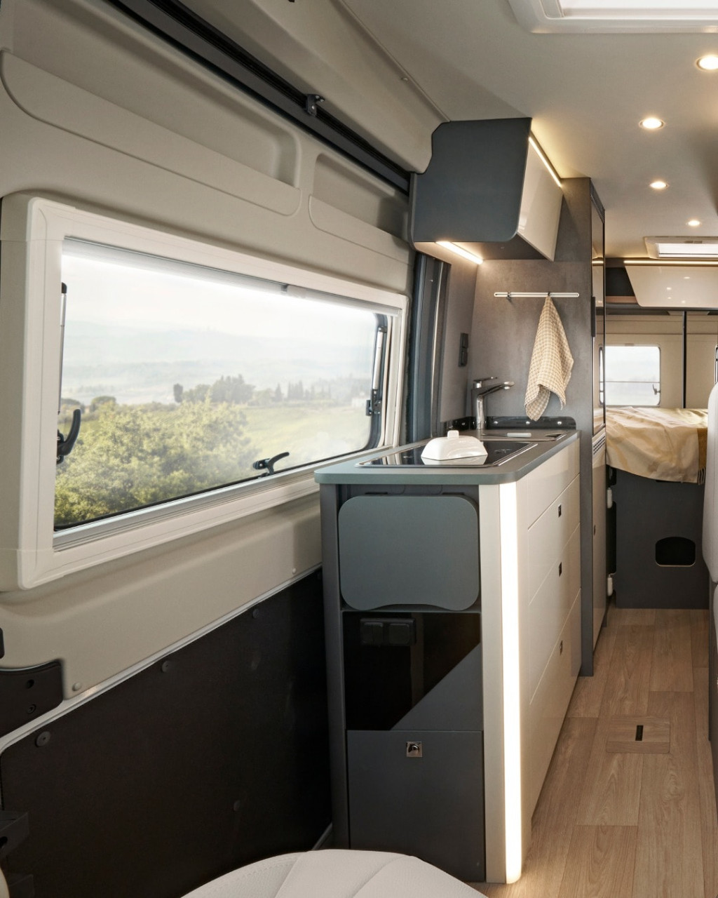 Срещу трапезния кът е кухненският блок. Макар да изглежда компактен, той включва удължение на плота и капаци за мивката и двукотлонния плот, така че зоната да се превърне в по-голям работен плот. Описани са още шкафове с гладки фронтове и заключващи се чекмеджета, както и хладилник и гардероб към задната част. Има опция и за по-голям хладилник, ако се пътува с четирима.