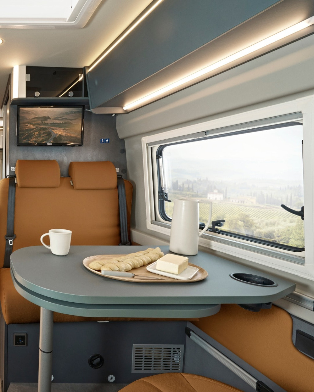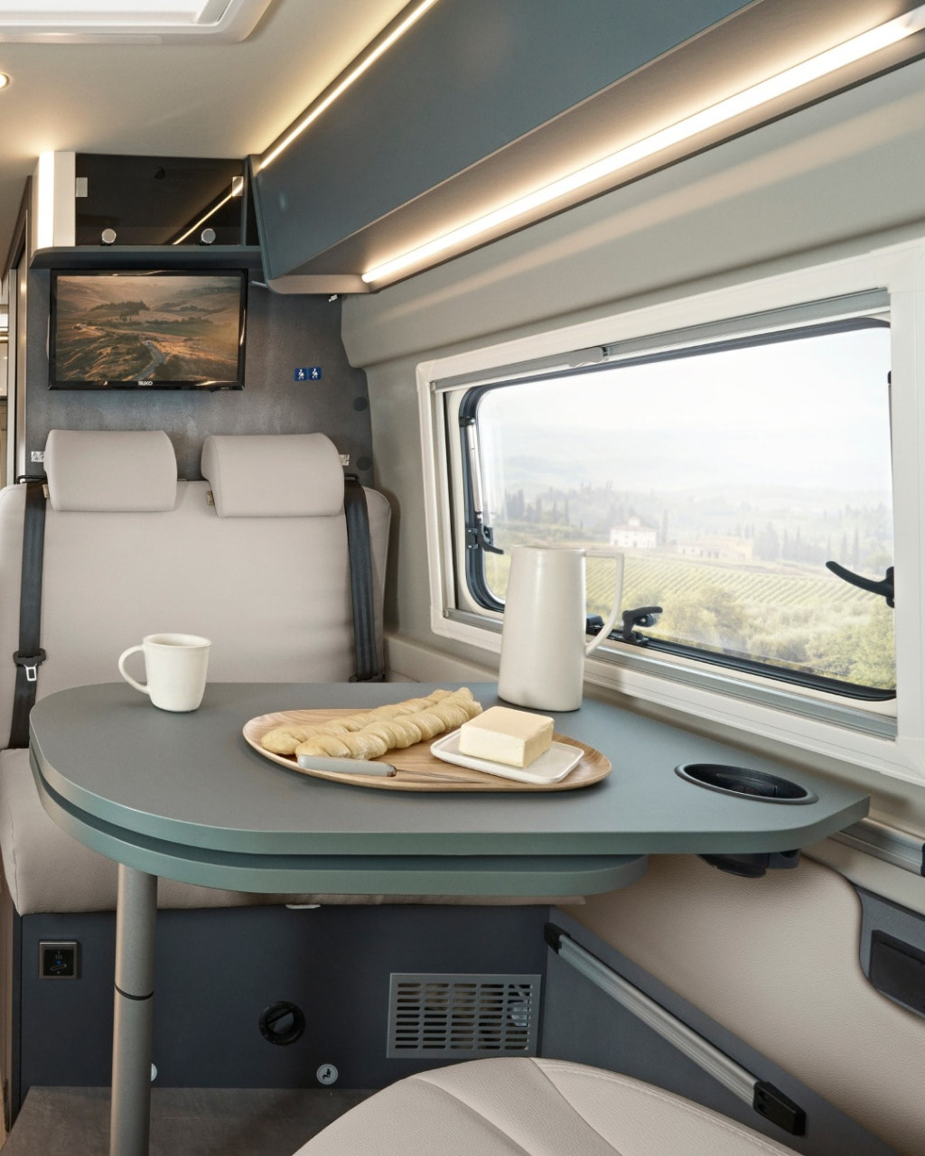 В дневната зона има трапезен кът за четирима, като предните седалки се завъртат, за да се включат към пейката за двама. Масѝчката може да се удължава, ако е нужно повече пространство.