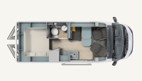 След спалната зона, отляво, е разположена баня, описана като „хибридна“, със завъртаща се тоалетна и мивка, като подът е оформен като душ-корито. Посочена е и типична за европейските кемпери схема: преграда, която се завърта към задната част, за да оформи отделна душ-кабина, която да пази останалото пространство сухо.