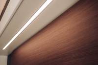Към предната част се запазва линията на вградени шкафове и вдлъбнати LED ленти, включително по ръба на тавана и вградена светлина при кухненския блок. Описани са и меки, подплатени панели, използвани за шумоизолация и изолация.