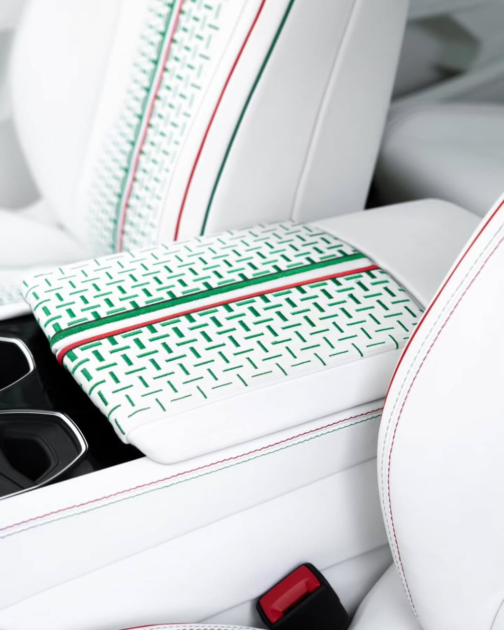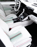 Екстериорът впечатлява веднага. Автомобилът е изцяло бял, а черните акценти придават контраст и агресивност. На каросерията присъстват мотиви с италианското знаме, а бодикитът включва разширени калници, прагове и остри линии на предната броня. Капакът е „мускулест“, а предните калници са обогатени с допълнителни декоративни елементи, които подсилват спортния характер.