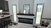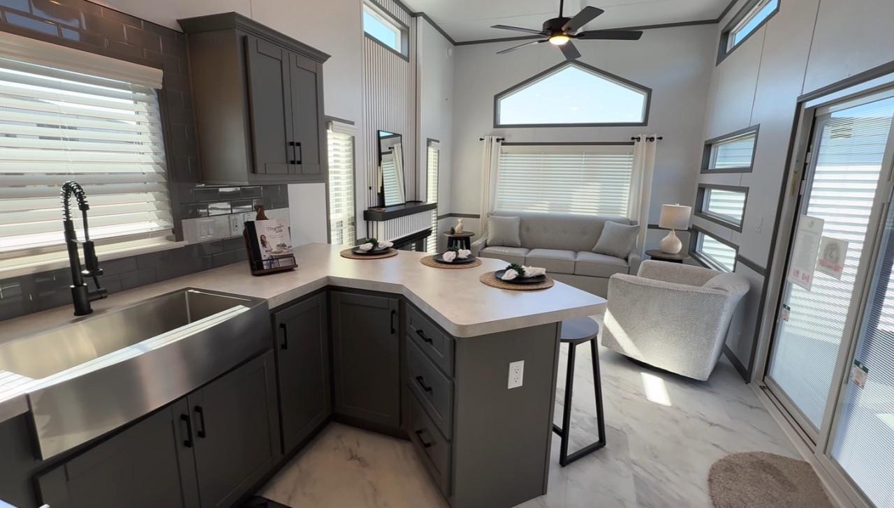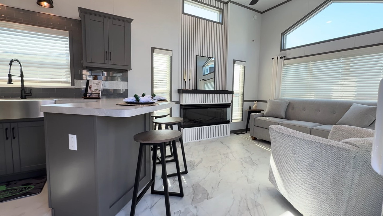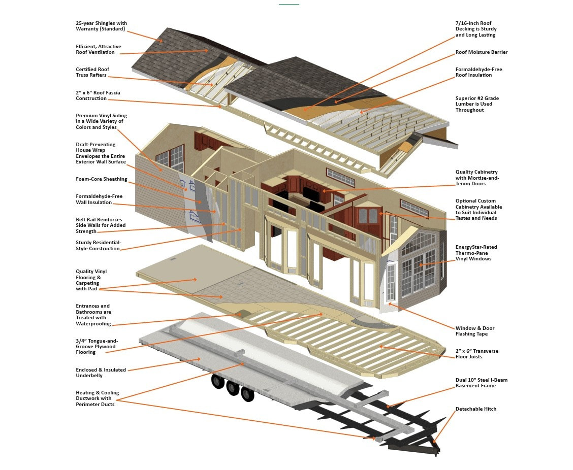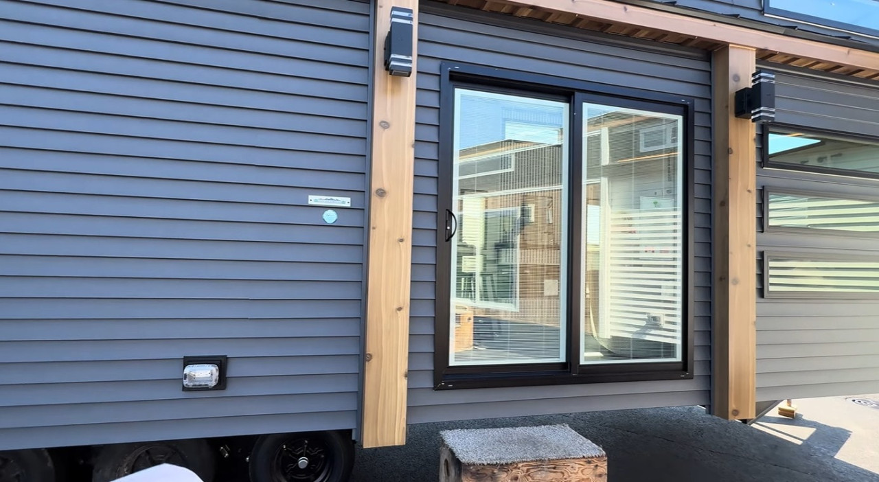 Къщата е построена върху четириосно шаси с dropped-frame зона в спалнята, която увеличава височината и създава усещане за простор. Външната облицовка е кедрова с метален покрив, но конфигурациите могат да се персонализират според вкуса на собственика. Двойната плъзгаща врата отвежда директно в дневната зона, където тристранна камина и TV стена придават уют, а извита кухня с GE уреди, мраморни плотове, истински дървени шкафове и фаянсов гръб съчетава стил и функционалност.