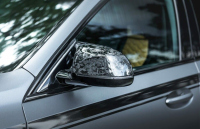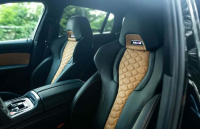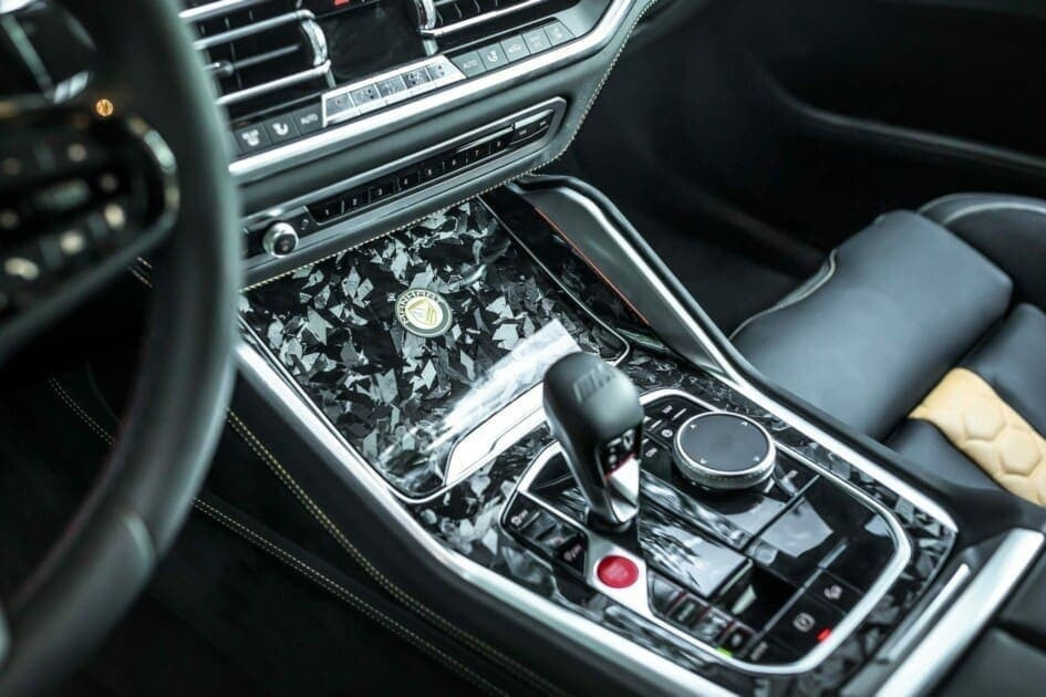 Тематиката с кован карбон продължава в салона: седалки, странични панели, пера за смяна на предавките и спици на волана. Комплект стелки Manhart завършва трансформацията.