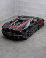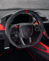 Почти всички оригинални панели са заменени с кован карбон. Отпред има нов капак с големи отвори и преработена броня. Крилата и вратите получават яркочервени зони, а около капака на двигателя минават червени ленти. Страничните прагове и въздухозаборници също са нови.