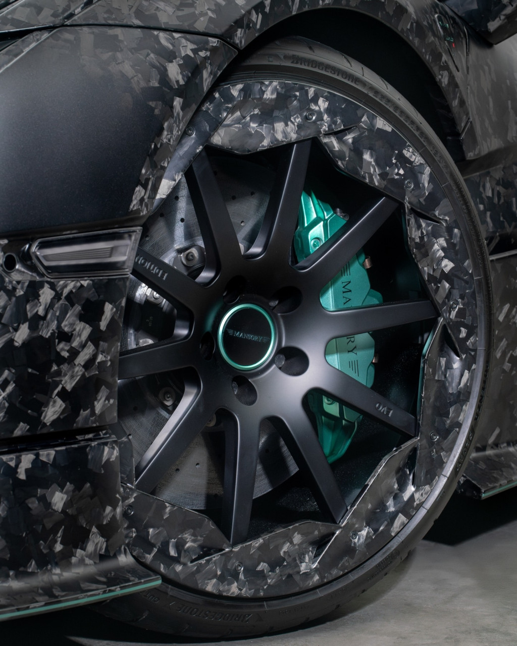 Колелата FV.10 са леки ковани джанти с външен карбонов пръстен, размери 10x21 отпред и 12.5x22 отзад, а спирачните апарати са в характерен тюркоазен цвят, който се среща и в интериора. Вътре доминира тъмен Alcantara с осветени панели на вратите и светещи лога Mansory.
