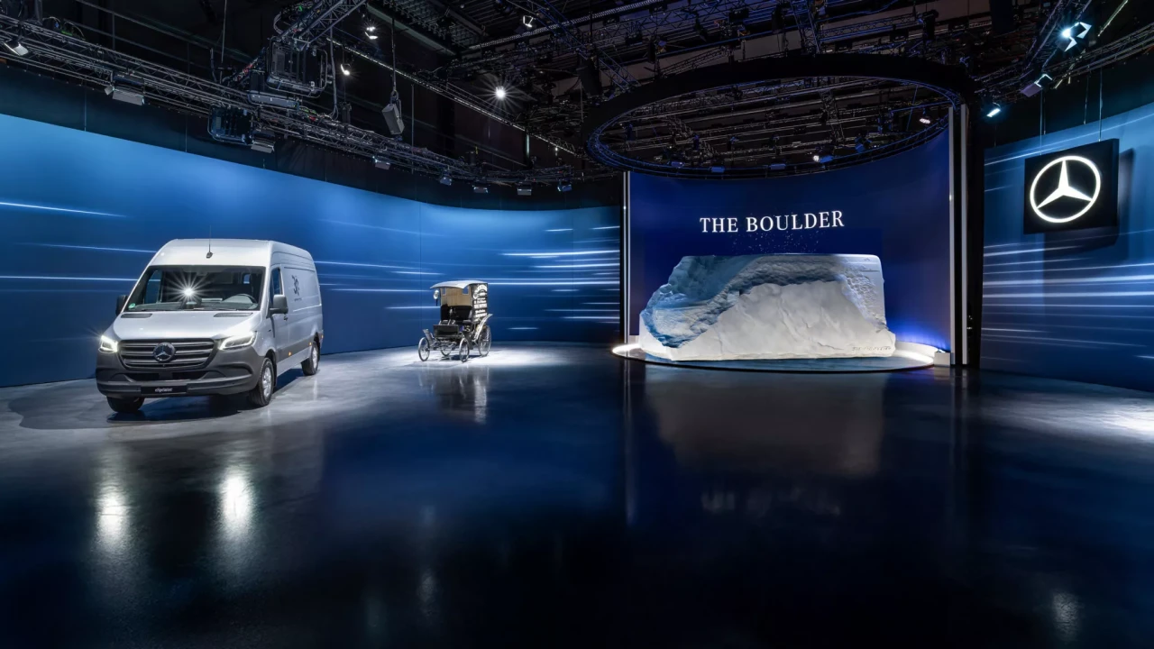 Скулптурата THE BOuLDER служи като първи поглед към бъдещия Sprinter, който ще комбинира по-изразителен стил с модулна VAN платформа, електрически и конвенционални задвижвания и усъвършенствана дигитална екосистема.