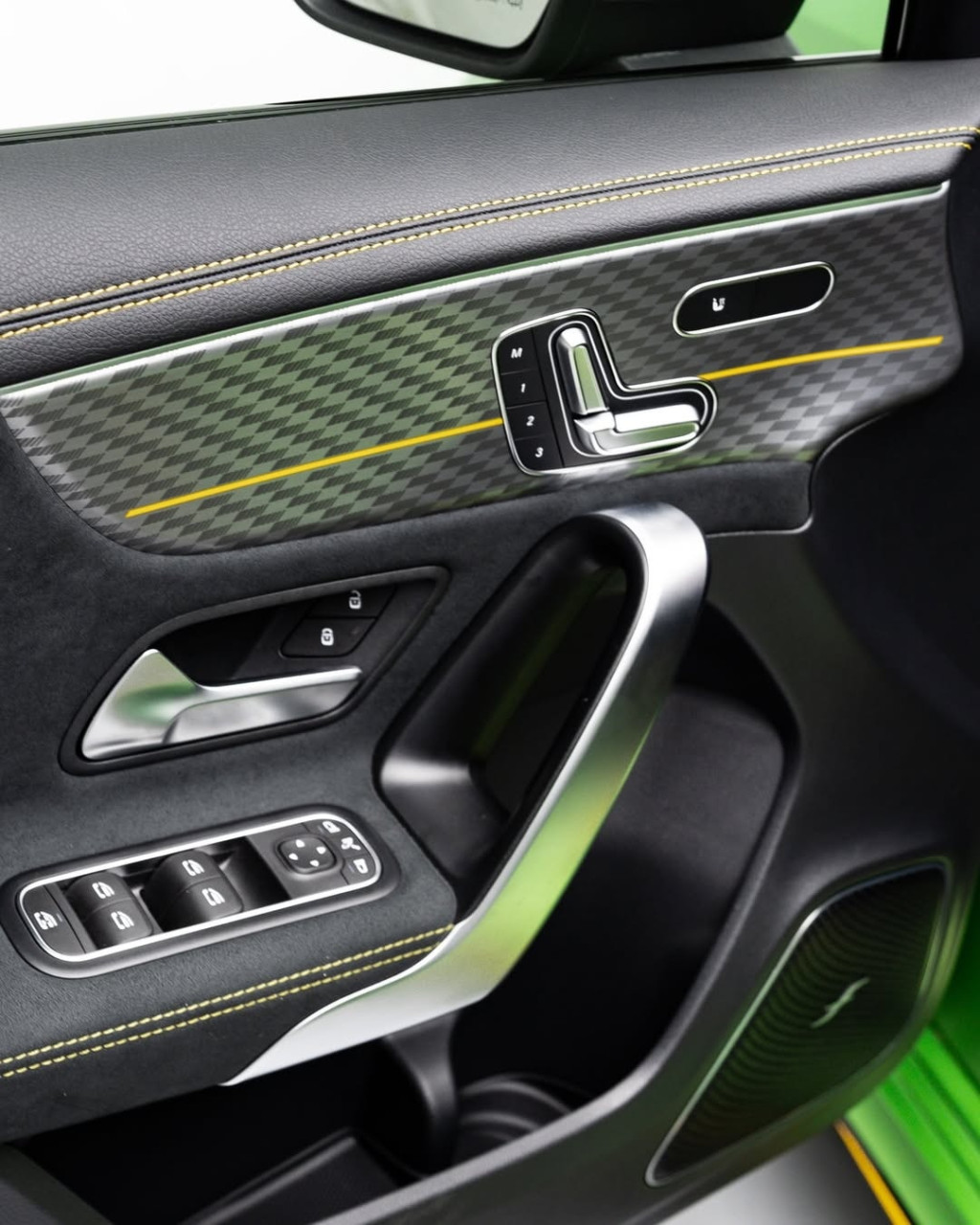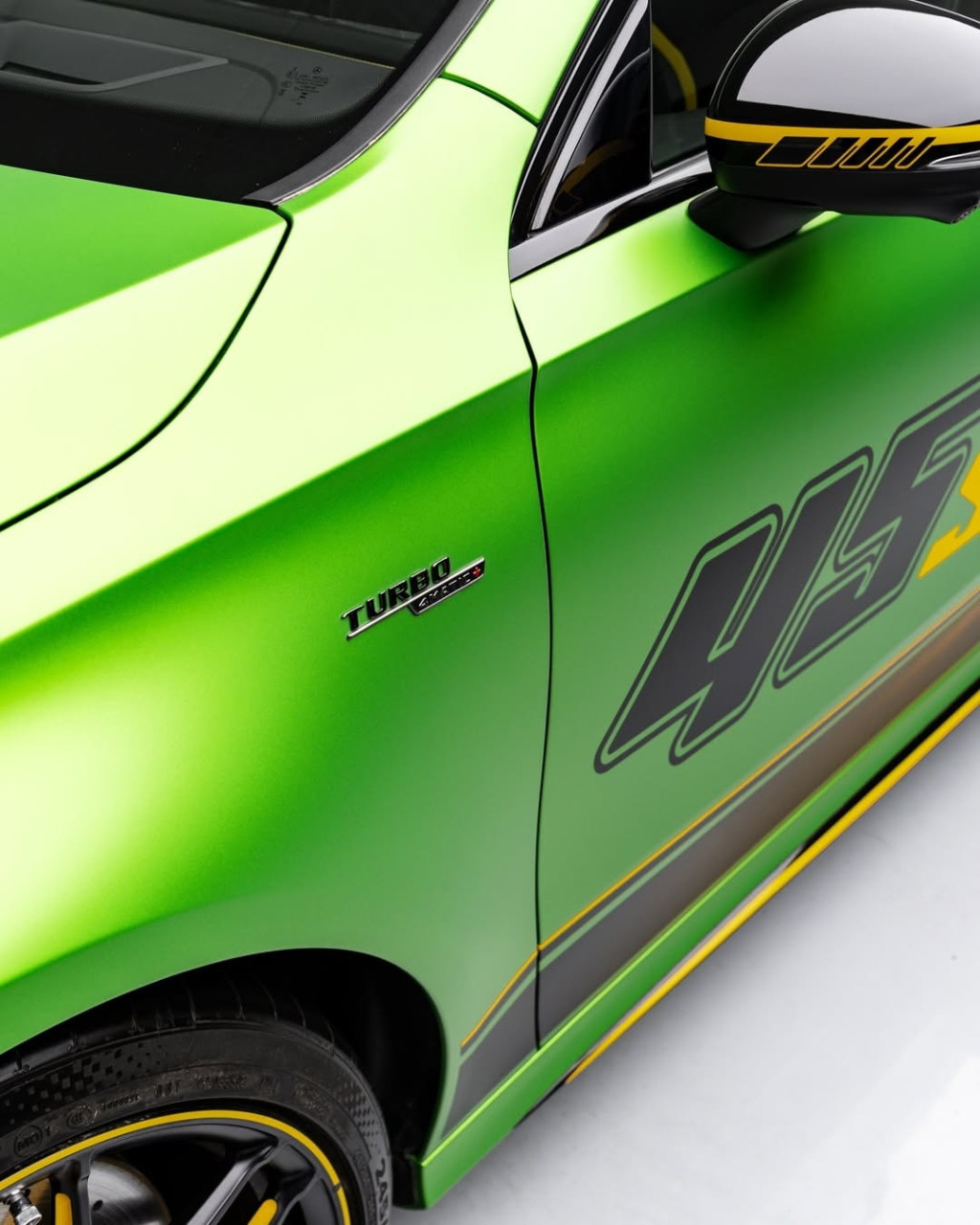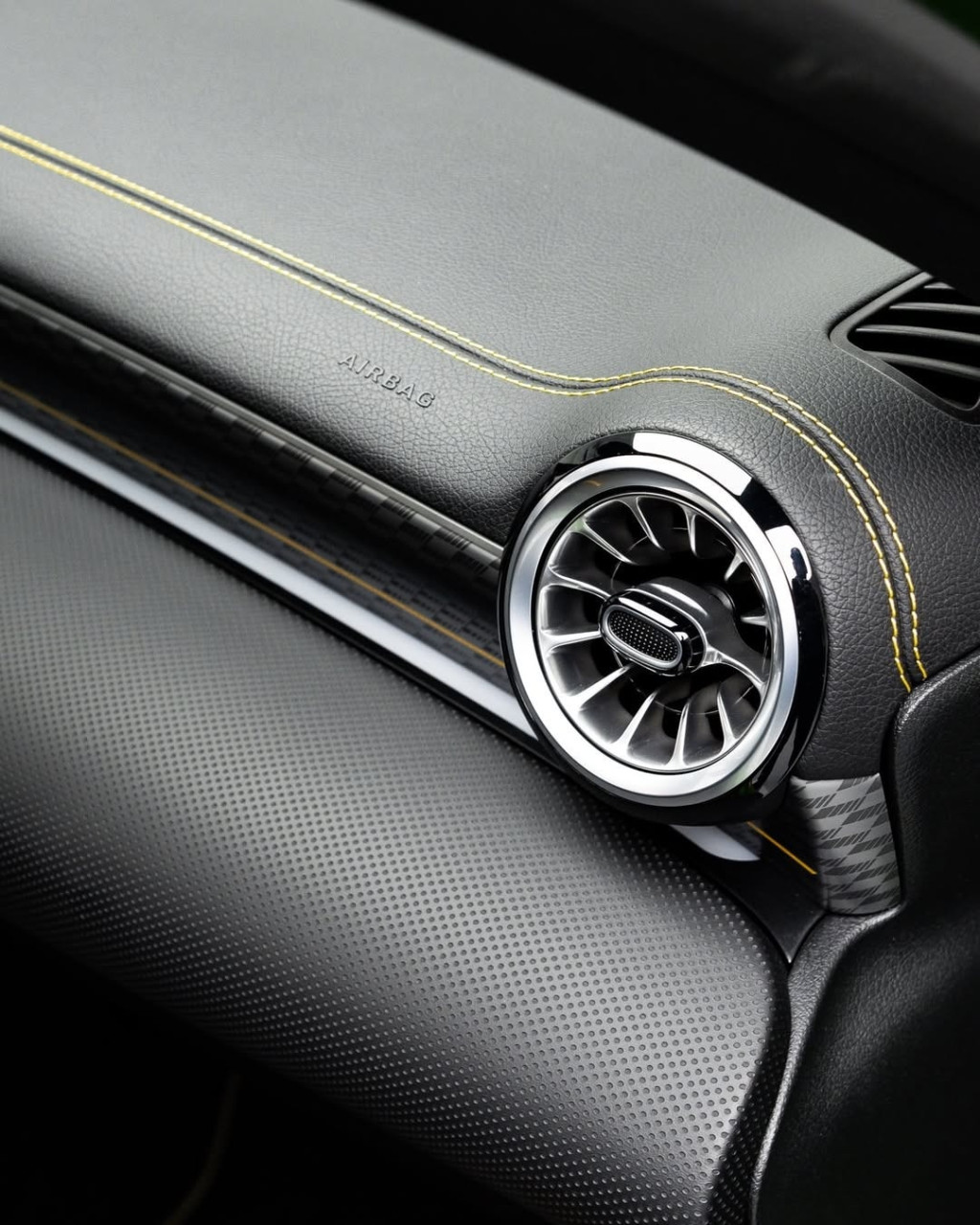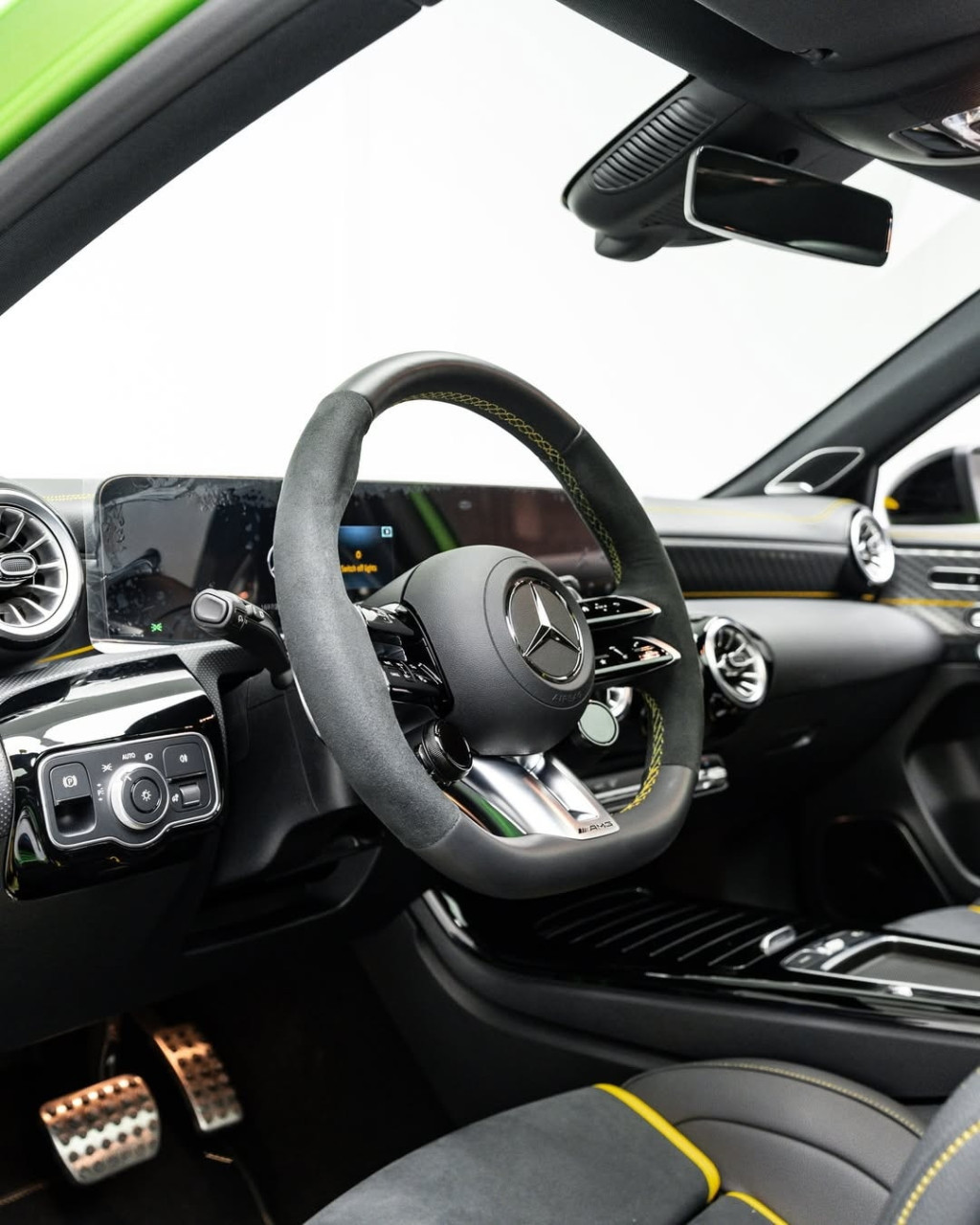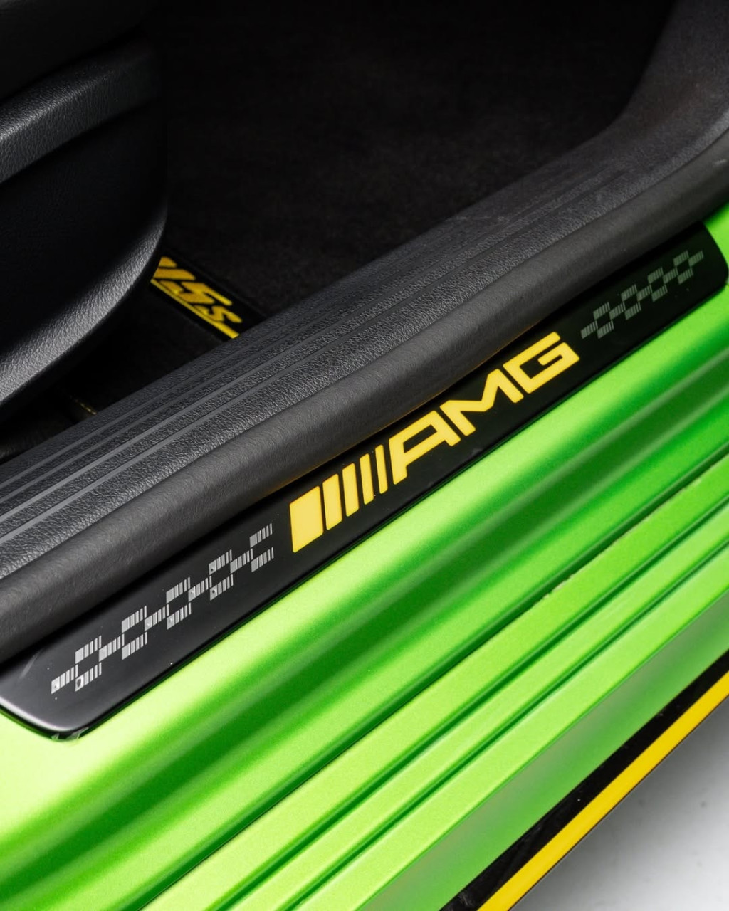 Сред отличителните елементи са посочени Green Hell Magno лак, 19-инчови ковани AMG джанти, безключов достъп и стартиране, Bluetooth, аудиосистема Burmester, стандартната конфигурация с два екрана, тапицерия от Alcantara и кожа, карбонови декоративни елементи и жълти контрастни шевове. Споменати са и специални елементи в облегалките за глава, допълнителни жълти детайли, амбиентно осветление с 64 цвята, безжична интеграция на смартфон и електрически седалки.