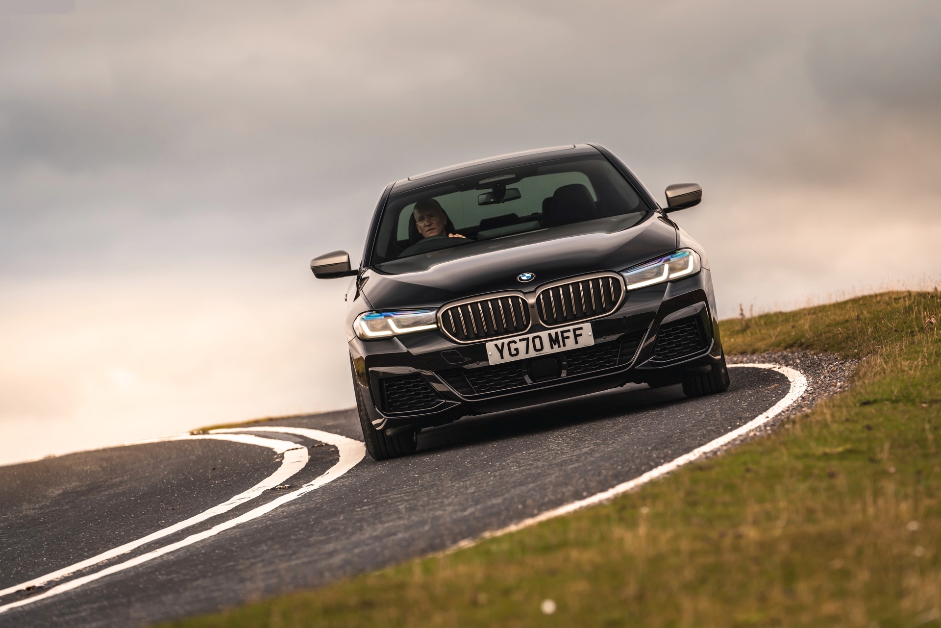 Тази й модификация пък очевидно е проектирана с бриф за сдържаност и класа. За разлика от някои нови беемвета, фейслифтът на петицата пази приглушения й, елегантен преден бъбрековиден облик, който, акомпаниран от естетизирано стеснените матрични лазерни светлинни блокове, я издига до една от най-добре изглеждащите коли в гамата им. Добавя и нотка на агресия със сиви акценти, аеродинамичен кит с модифицирана предна броня, фин, тънък спойлер върху капака на багажника и двойни трапецовидни изпускателни накрайници, разположени от двете страни на дифузьора под новите триизмерни задни диоди. Допълнителните 20-цолови джанти тип 668 М на чакащата ме отпред кола са истински сочно допълнение към ефектните нюанси на цвета – това е метал, в който няма да имате нищо против да ви виждат. Благодарение и на специфичната аеродинамична обработка на предната част, включваща и активните клапи в решетката, коефициентът на въздушно съпротивление е свален до радикалните 0,23.
