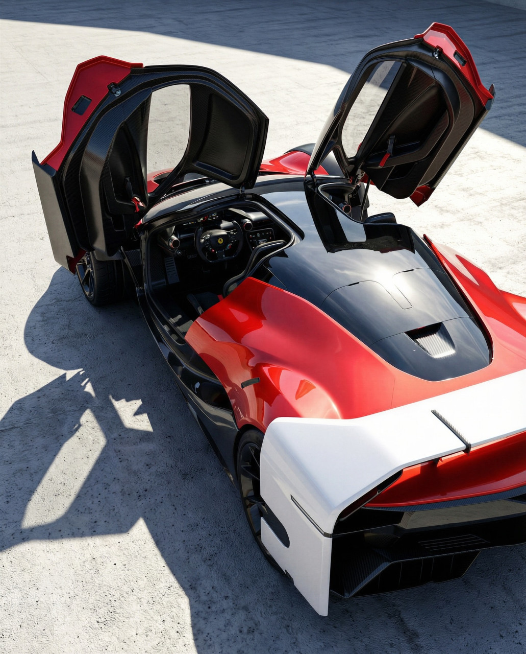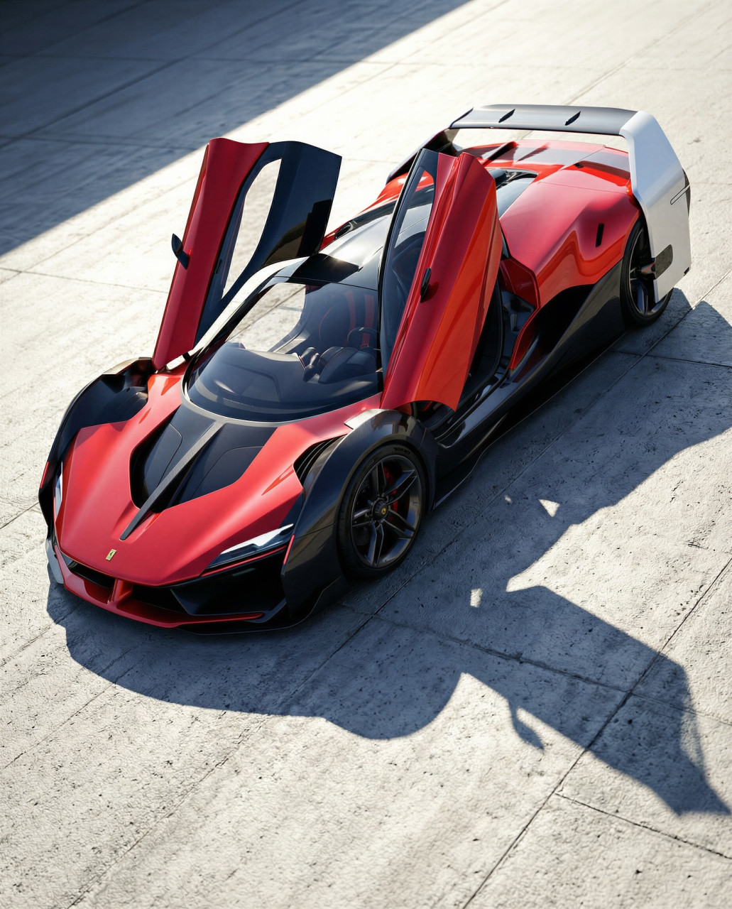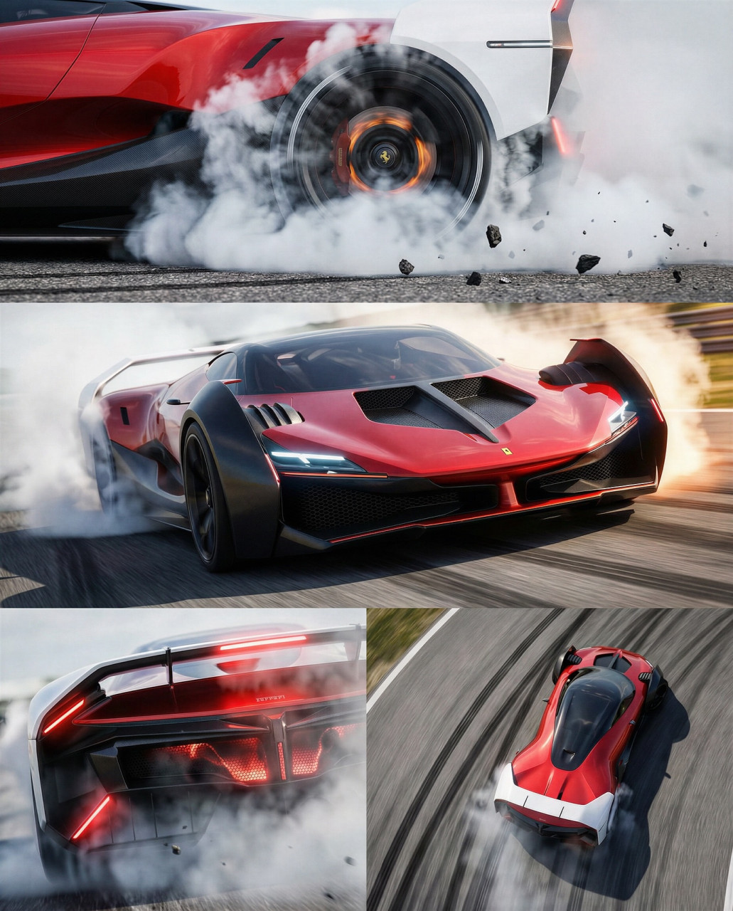 Именно в този контекст се появява дигиталният проект Ferrari MXXE, който авторът представя като концепция, отдаваща почит на корените на Ferrari във Формула 1. По думите в материала, предната част е „безспорно Ferrari“, но предните калници са като полуотворени капаци на колелата. Описани са и „пеперудени“ врати, които се простират върху покрива и включват както вертикални, така и хоризонтални прозорци.